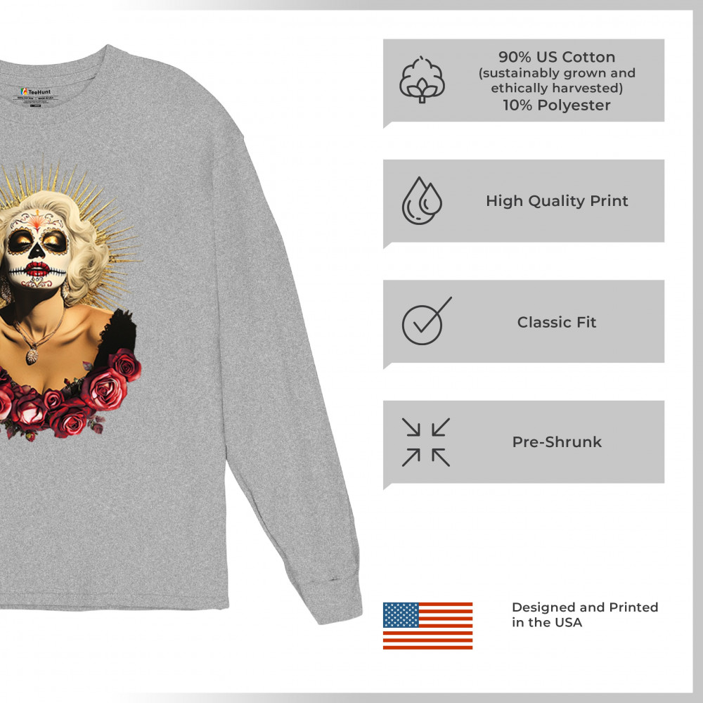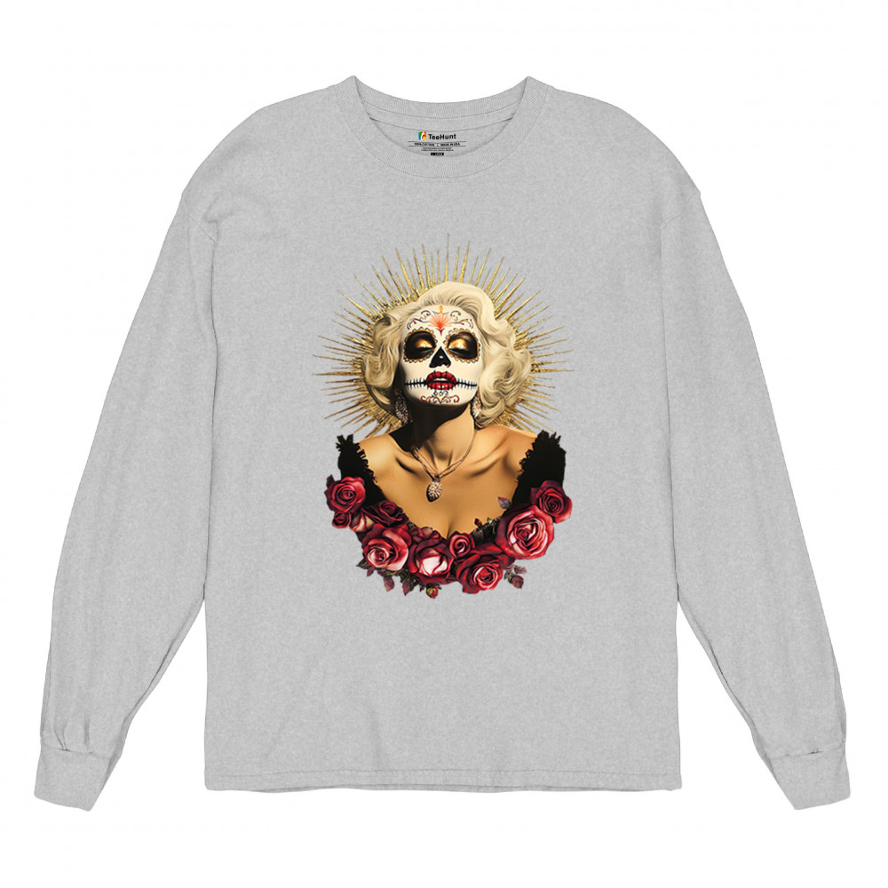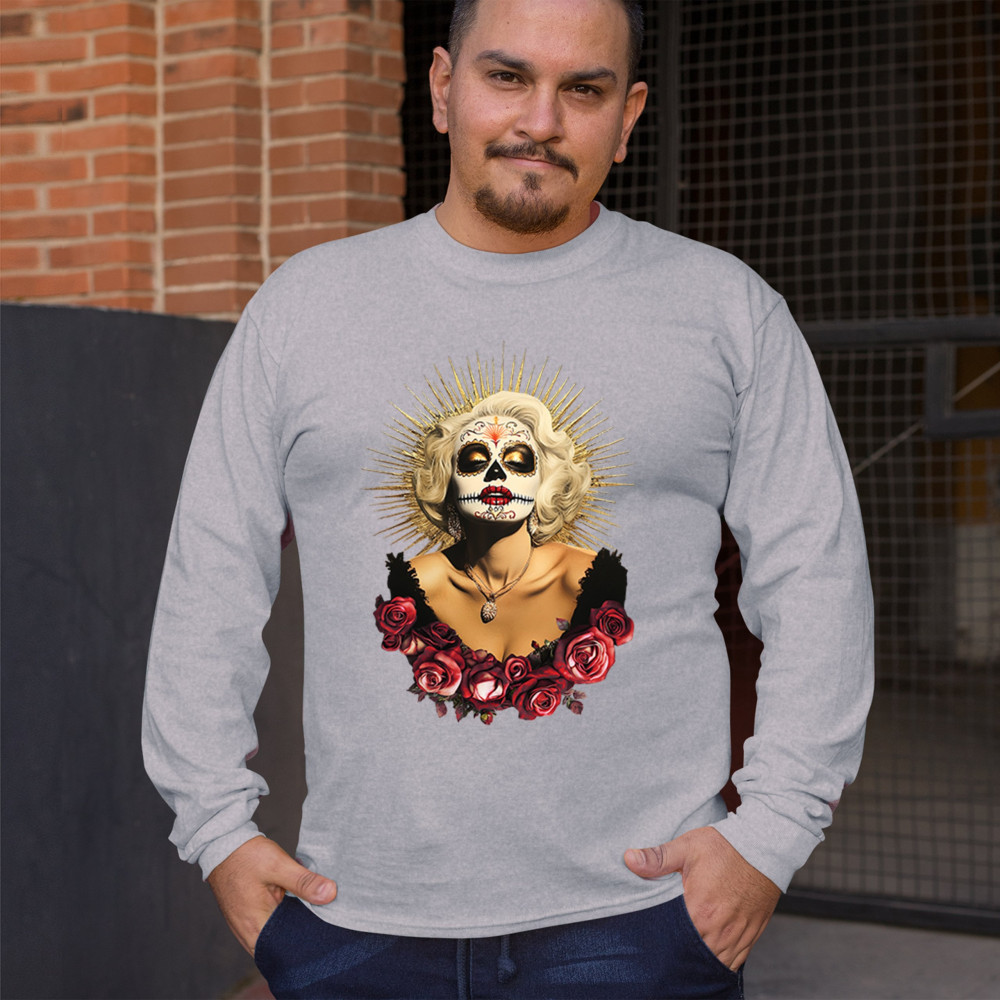 This bold and beautiful sugar skull design features a glamorous calavera woman crowned in a golden halo and framed by roses. A divine tribute to Dia de los Muertos, this look blends vintage glam, Latin culture, makeup artistry, and sacred symbolism. Perfect for fans of gothic beauty, Halloween, and heritage expression.