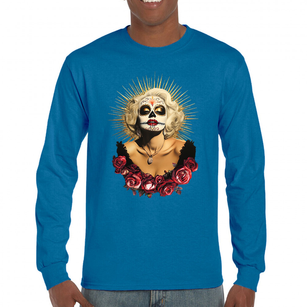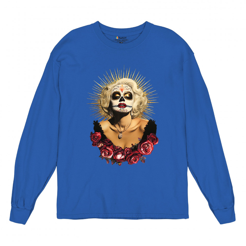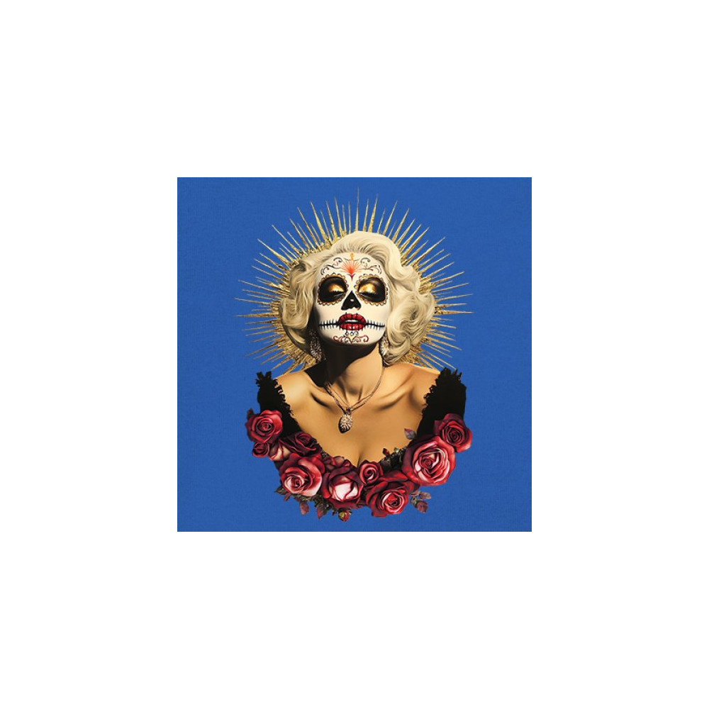 This bold and beautiful sugar skull design features a glamorous calavera woman crowned in a golden halo and framed by roses. A divine tribute to Dia de los Muertos, this look blends vintage glam, Latin culture, makeup artistry, and sacred symbolism. Perfect for fans of gothic beauty, Halloween, and heritage expression.