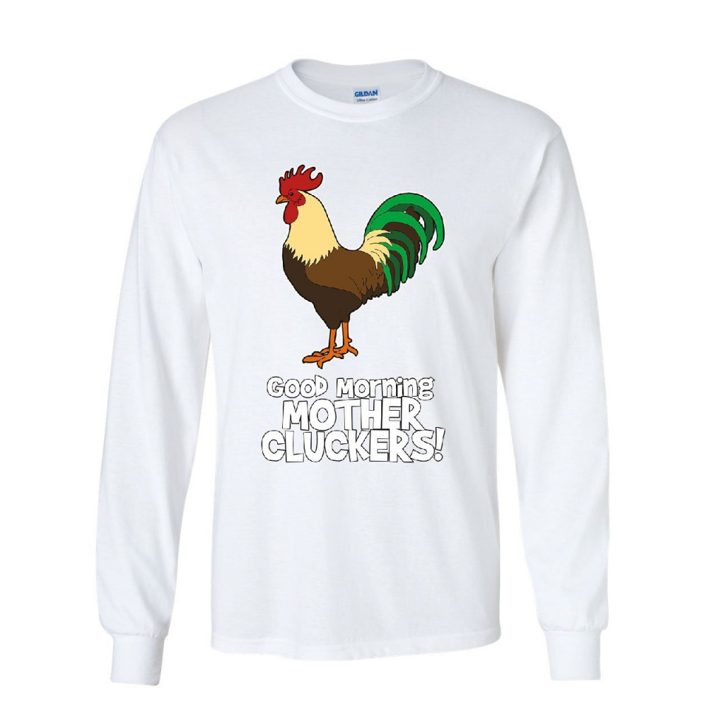 GOOD MORNING MOTHER CLUCKERS long sleeve t-shirt funny adult humor rooster tee white