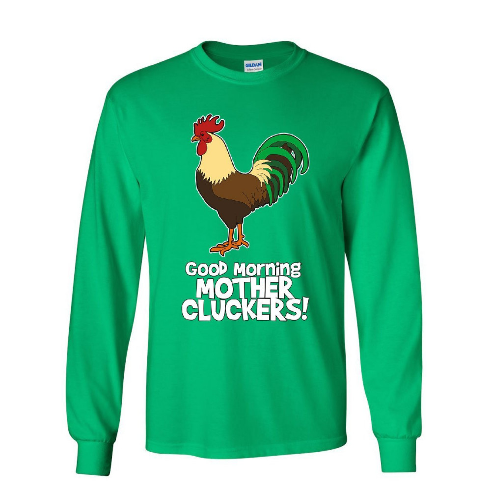 GOOD MORNING MOTHER CLUCKERS long sleeve t-shirt funny adult humor rooster tee green