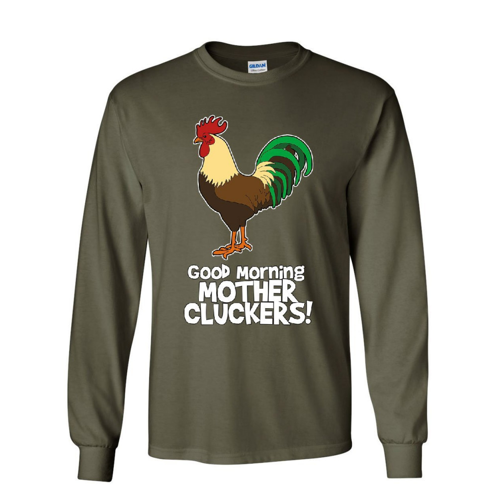 GOOD MORNING MOTHER CLUCKERS long sleeve t-shirt funny adult humor rooster tee military green