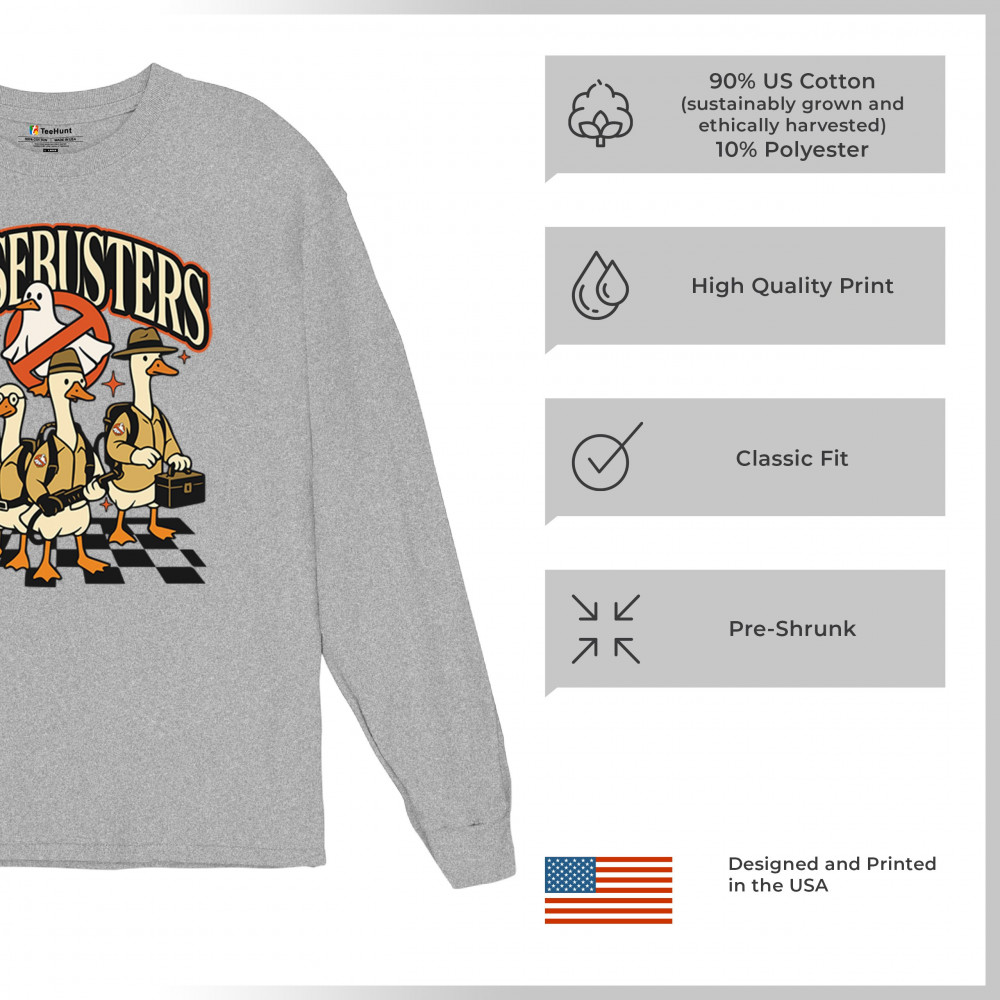 Celebrate October 31 with our Goosebusters shirt—a perfect mix of spooky and parody fun. This halloween goose design combines silly goose humor with ghost-busting style, making it a must-have for fans of funny goose shirts and spooky goose shirts. Ideal as a goose costume tee, goose parody shirt, or comedy bird shirt, this silly design adds Trick or Treat laughter to any haunted house or scary night.