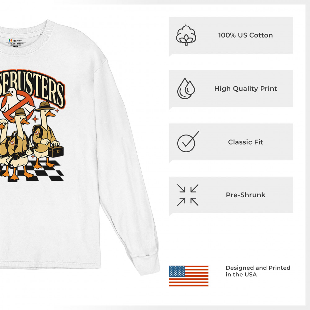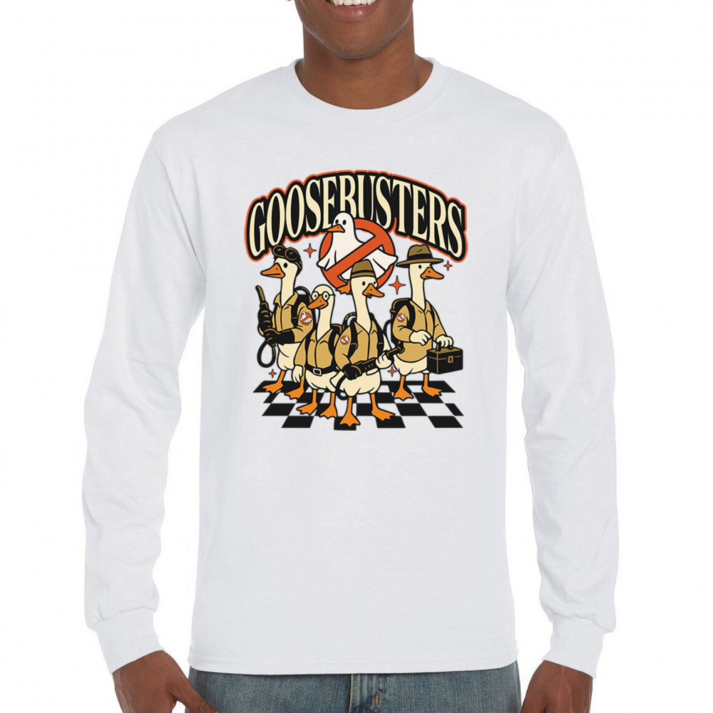 Celebrate October 31 with our Goosebusters shirt—a perfect mix of spooky and parody fun. This halloween goose design combines silly goose humor with ghost-busting style, making it a must-have for fans of funny goose shirts and spooky goose shirts. Ideal as a goose costume tee, goose parody shirt, or comedy bird shirt, this silly design adds Trick or Treat laughter to any haunted house or scary night.