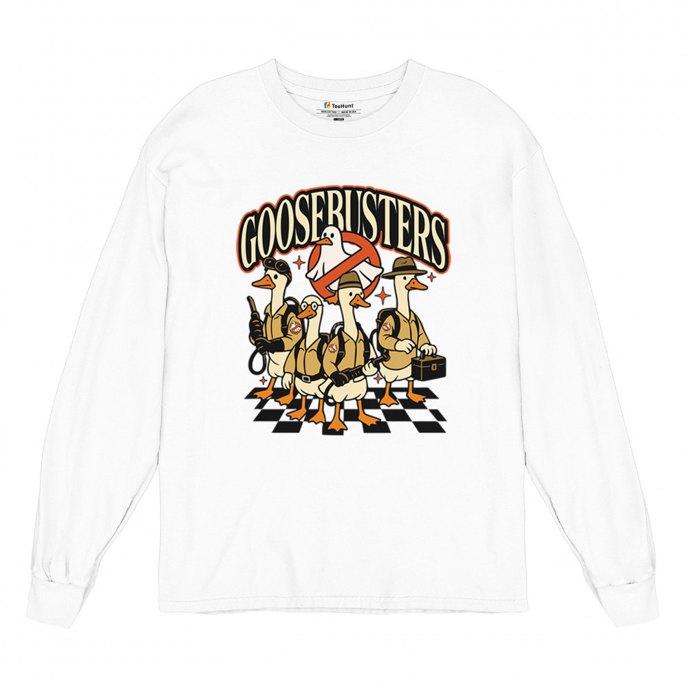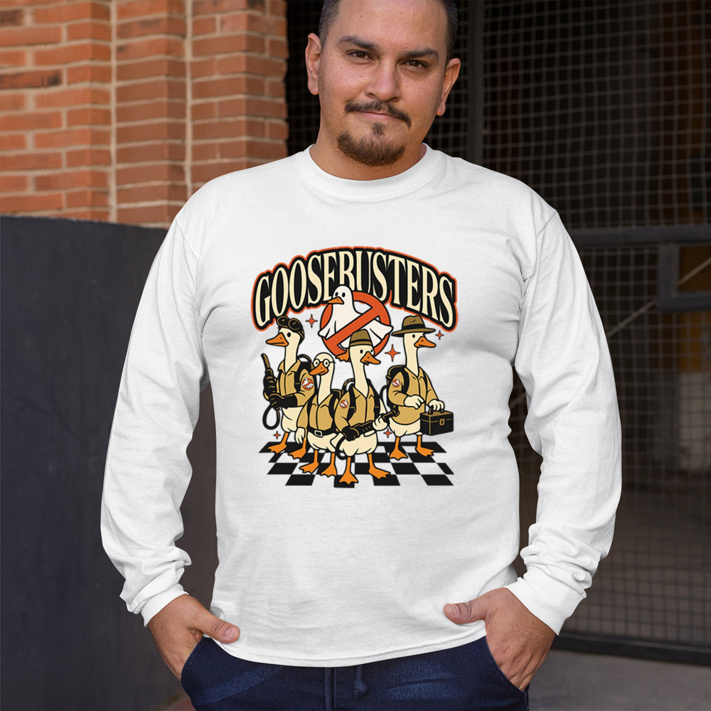 Goosebusters Halloween goose parody shirt – spooky goose design with silly goose humor, comedy bird style, Trick or Treat fun, and creepy night vibes.