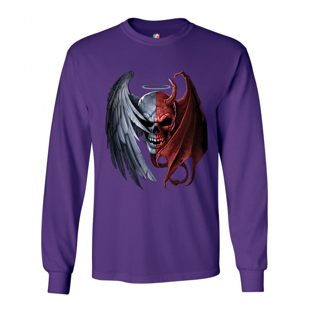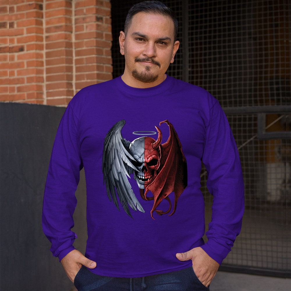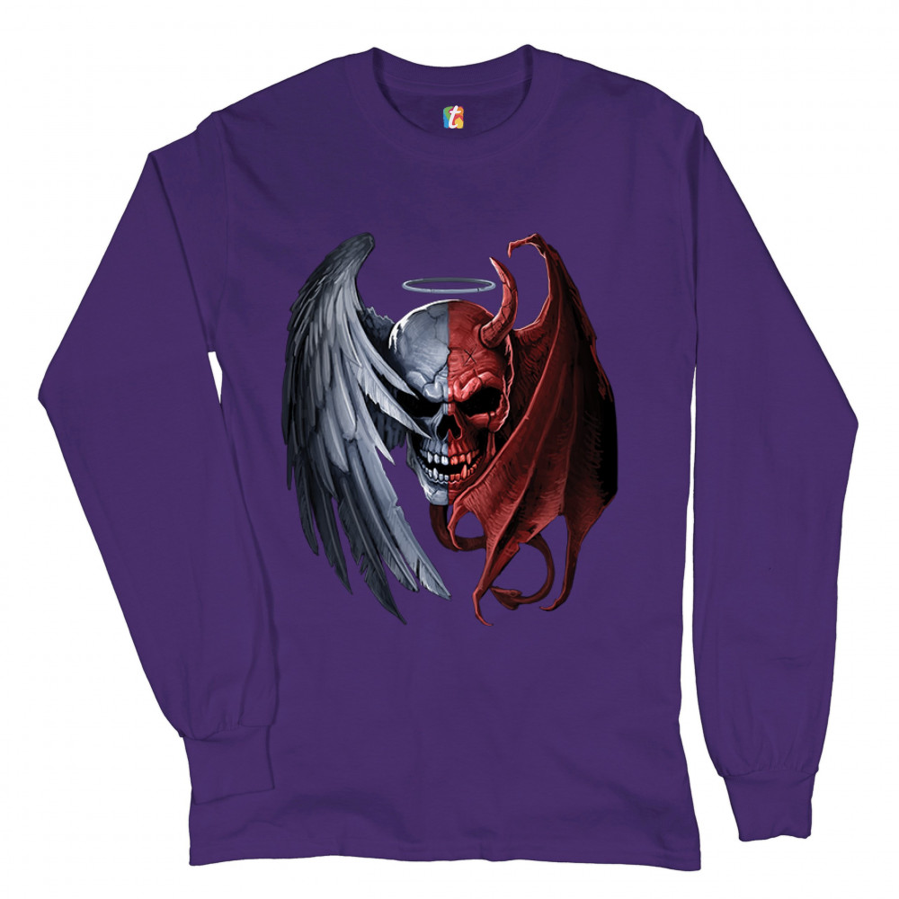 A print featuring a skull face, one half of which is light and has an angel's wing covering it and the other is dark with a horn sticking out of the forehead and a demon's wing. Below the skull you can see a demon's tail and a halo above it. A great