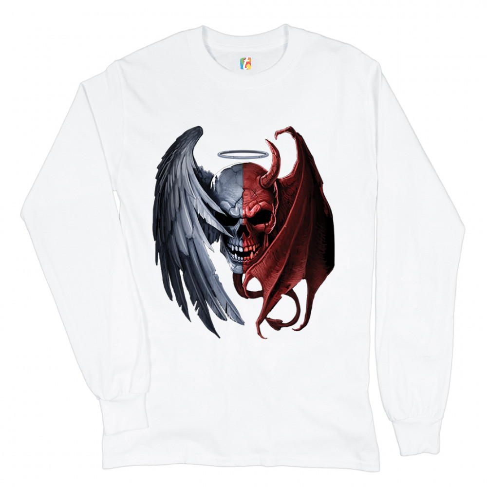 A print featuring a skull face, one half of which is light and has an angel's wing covering it and the other is dark with a horn sticking out of the forehead and a demon's wing. Below the skull you can see a demon's tail and a halo above it. A great