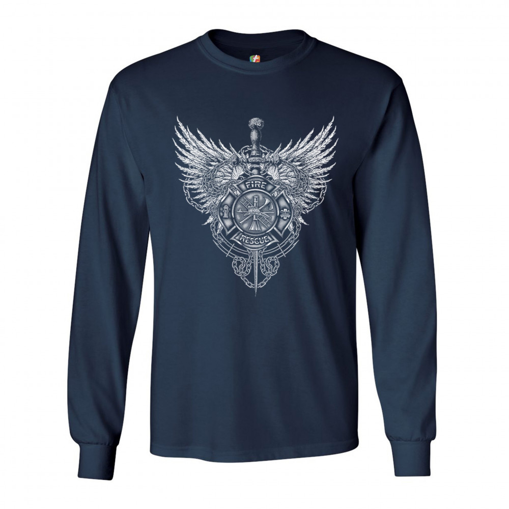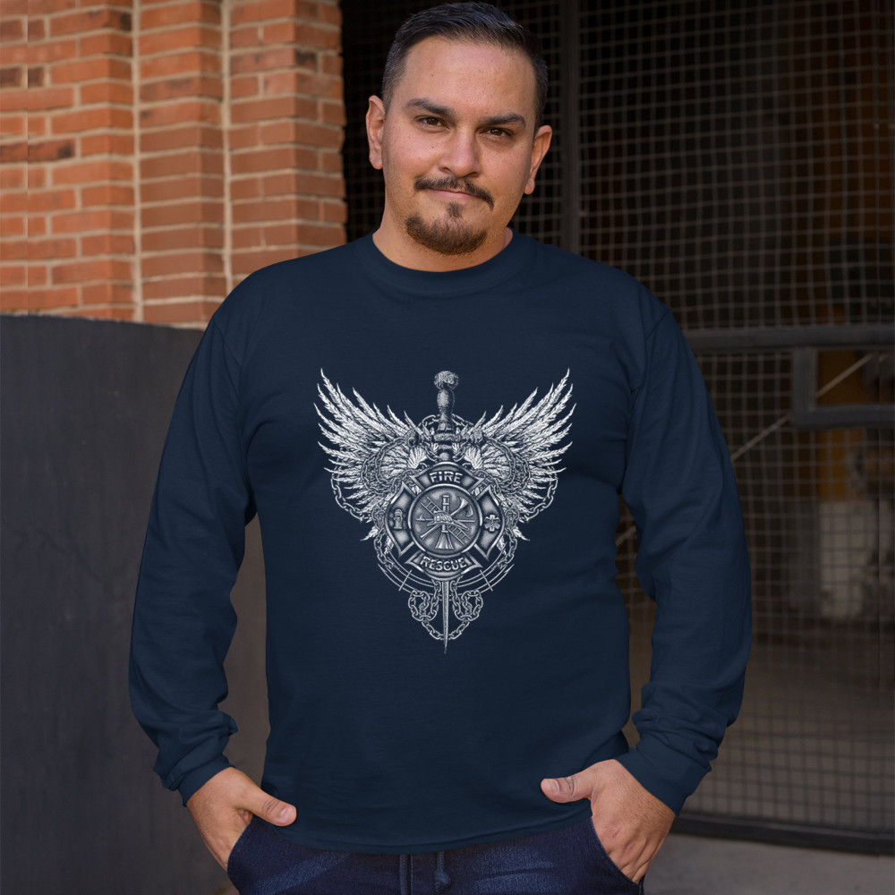 GOTHIC FIREFIGHTER EMBLEM long sleeve t-shirt courage honor sacrifice navy blue