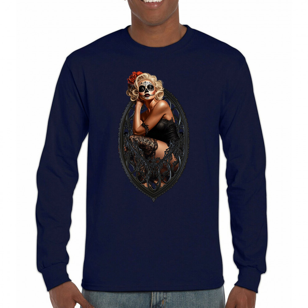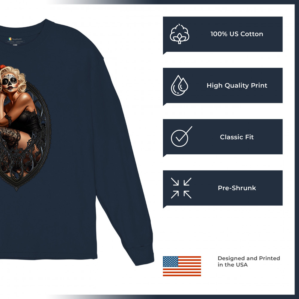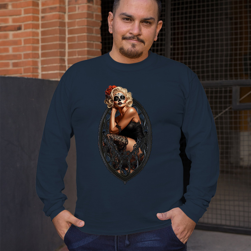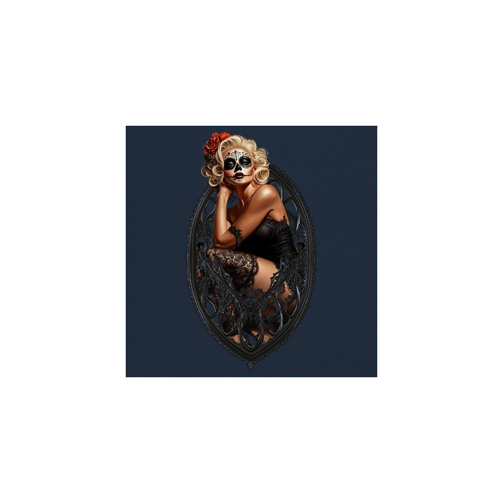 This sultry sugar skull pinup design blends gothic lace, seductive pose, and ornate frame detail for a bold Day of the Dead tribute. With striking makeup and vintage lingerie styling, it’s perfect for fans of macabre fashion, calavera art, and dark romance. A hauntingly beautiful mix of allure, attitude, and Dia de los Muertos charm.