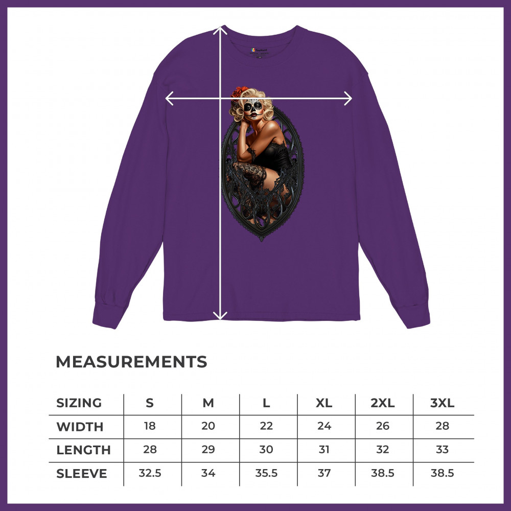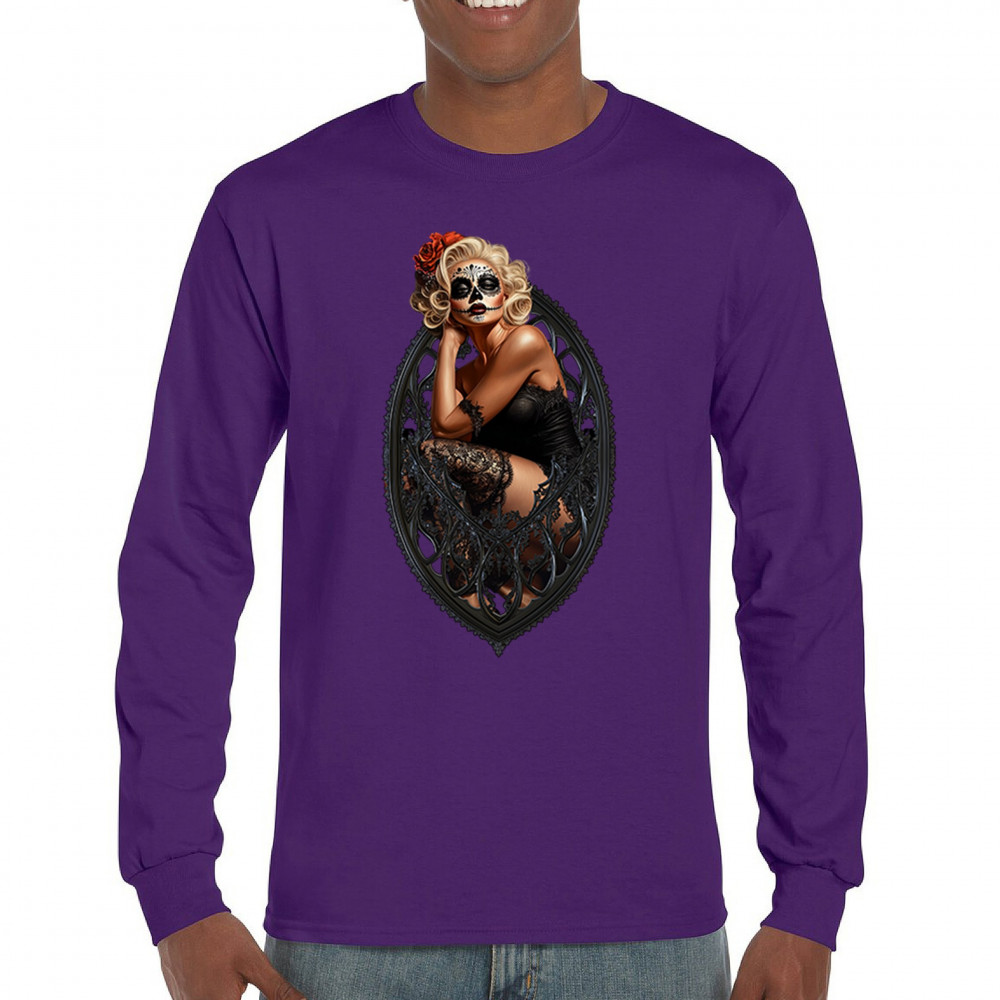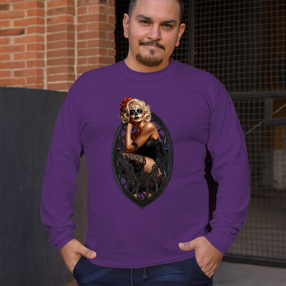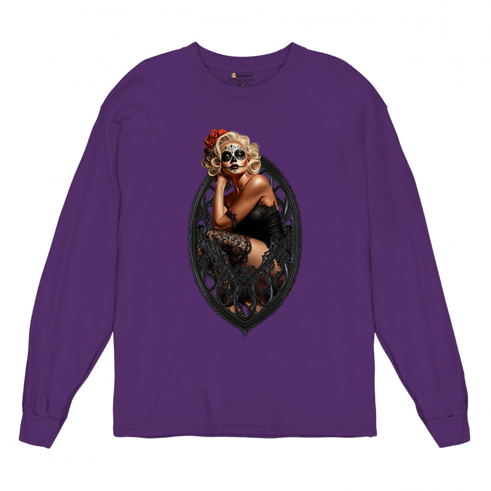 This sultry sugar skull pinup design blends gothic lace, seductive pose, and ornate frame detail for a bold Day of the Dead tribute. With striking makeup and vintage lingerie styling, it’s perfect for fans of macabre fashion, calavera art, and dark romance. A hauntingly beautiful mix of allure, attitude, and Dia de los Muertos charm.