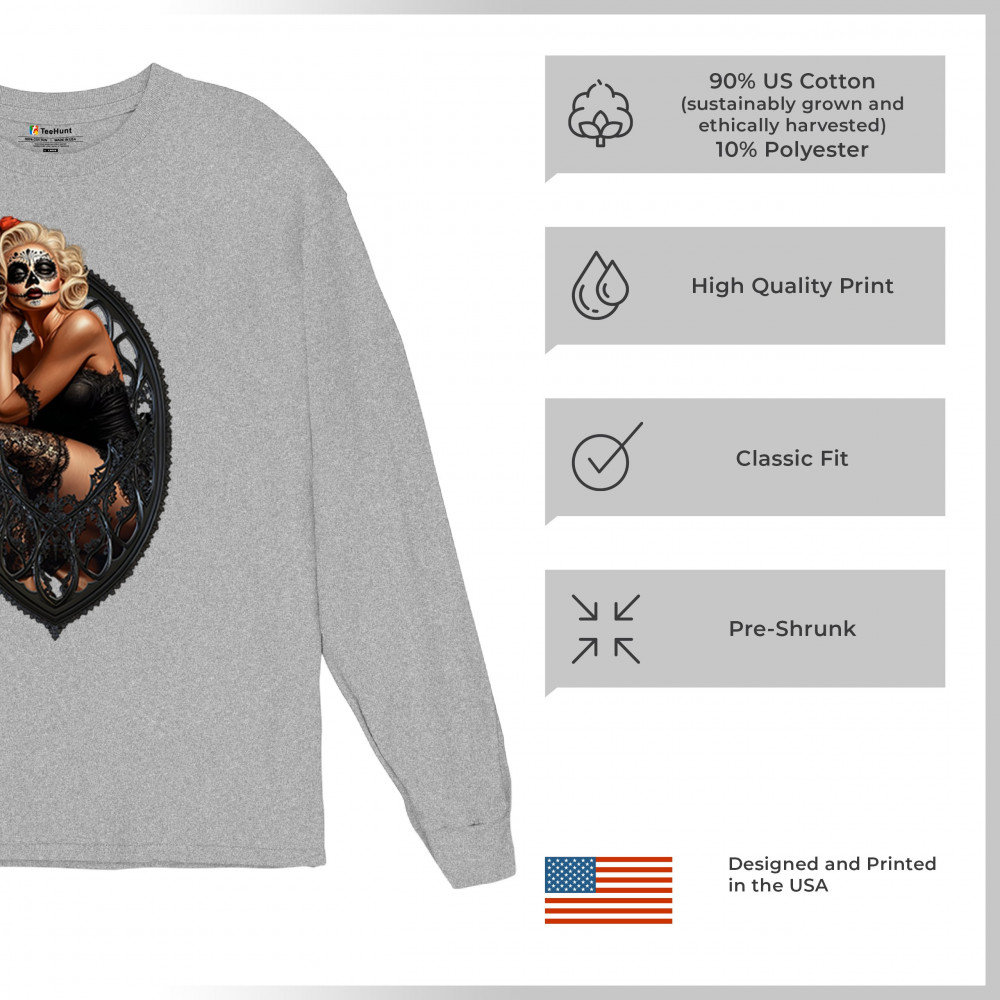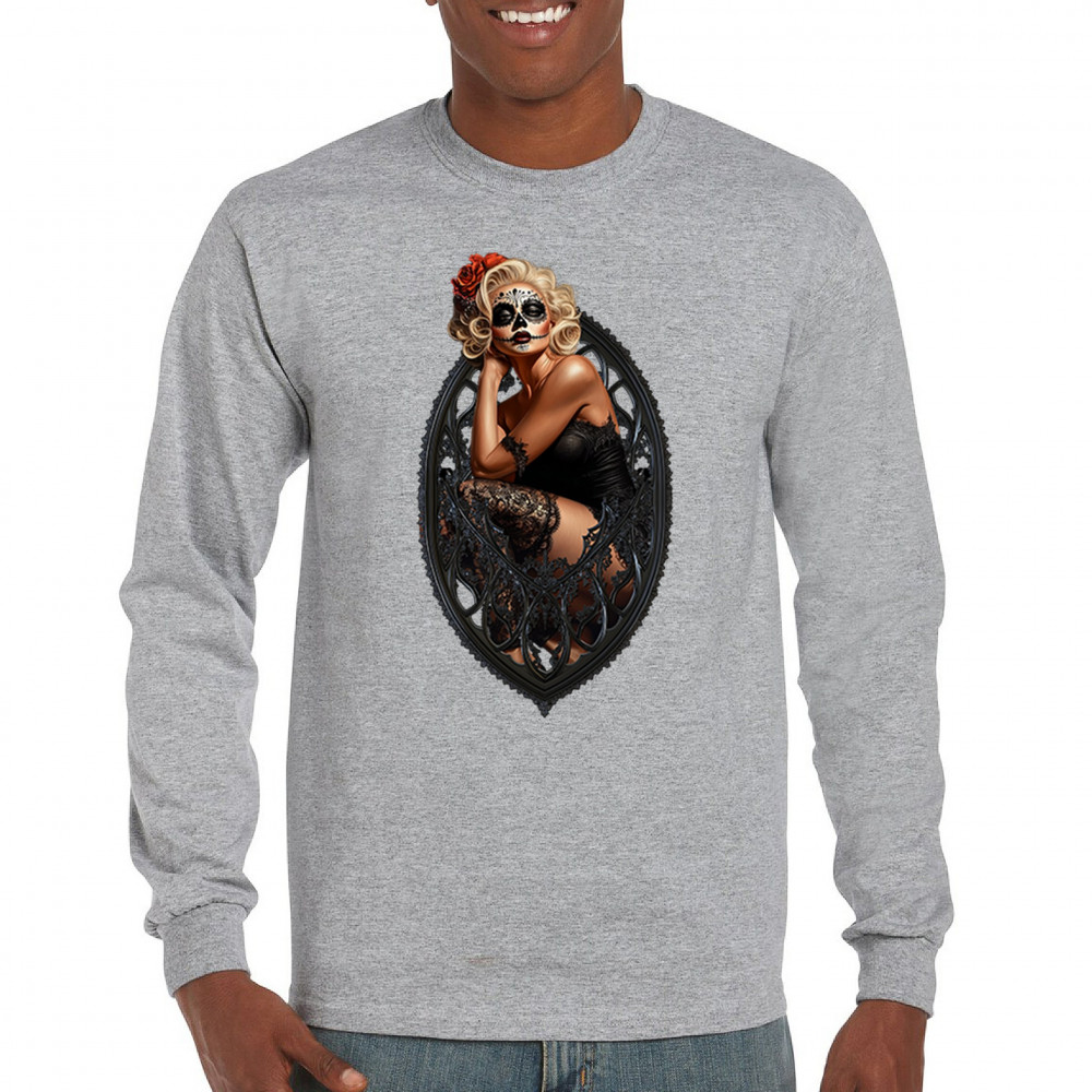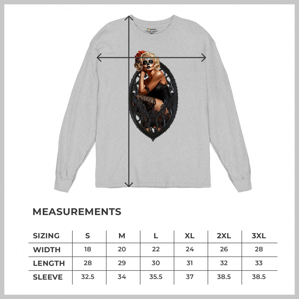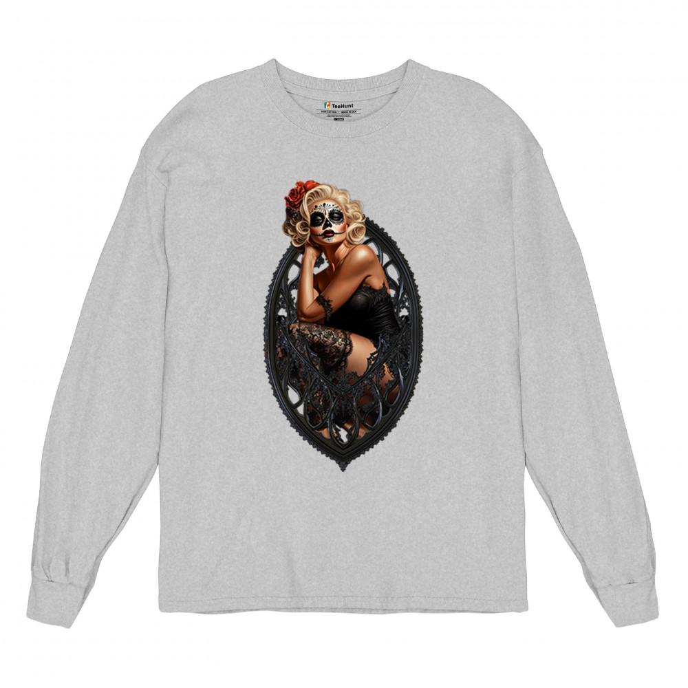 This sultry sugar skull pinup design blends gothic lace, seductive pose, and ornate frame detail for a bold Day of the Dead tribute. With striking makeup and vintage lingerie styling, it’s perfect for fans of macabre fashion, calavera art, and dark romance. A hauntingly beautiful mix of allure, attitude, and Dia de los Muertos charm.