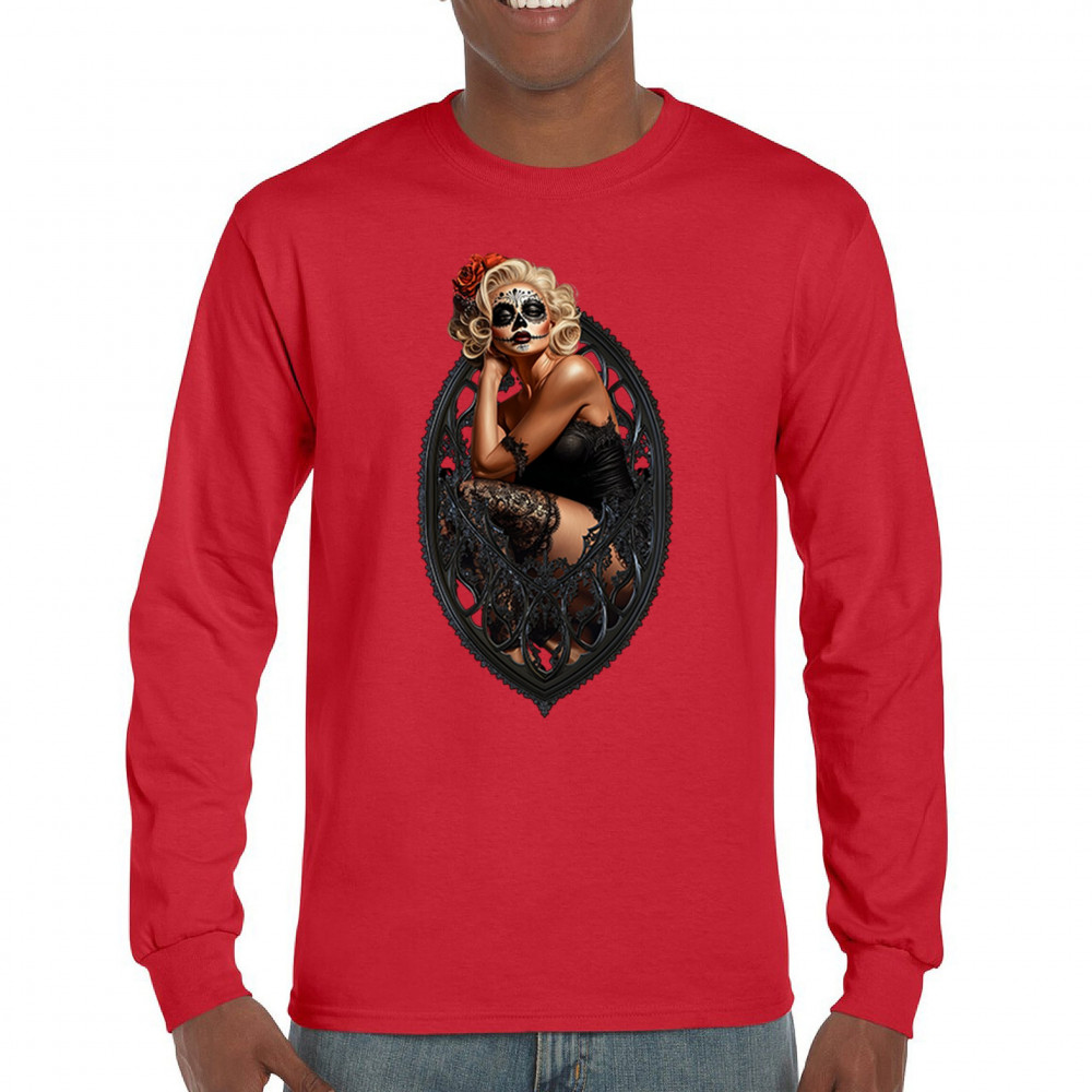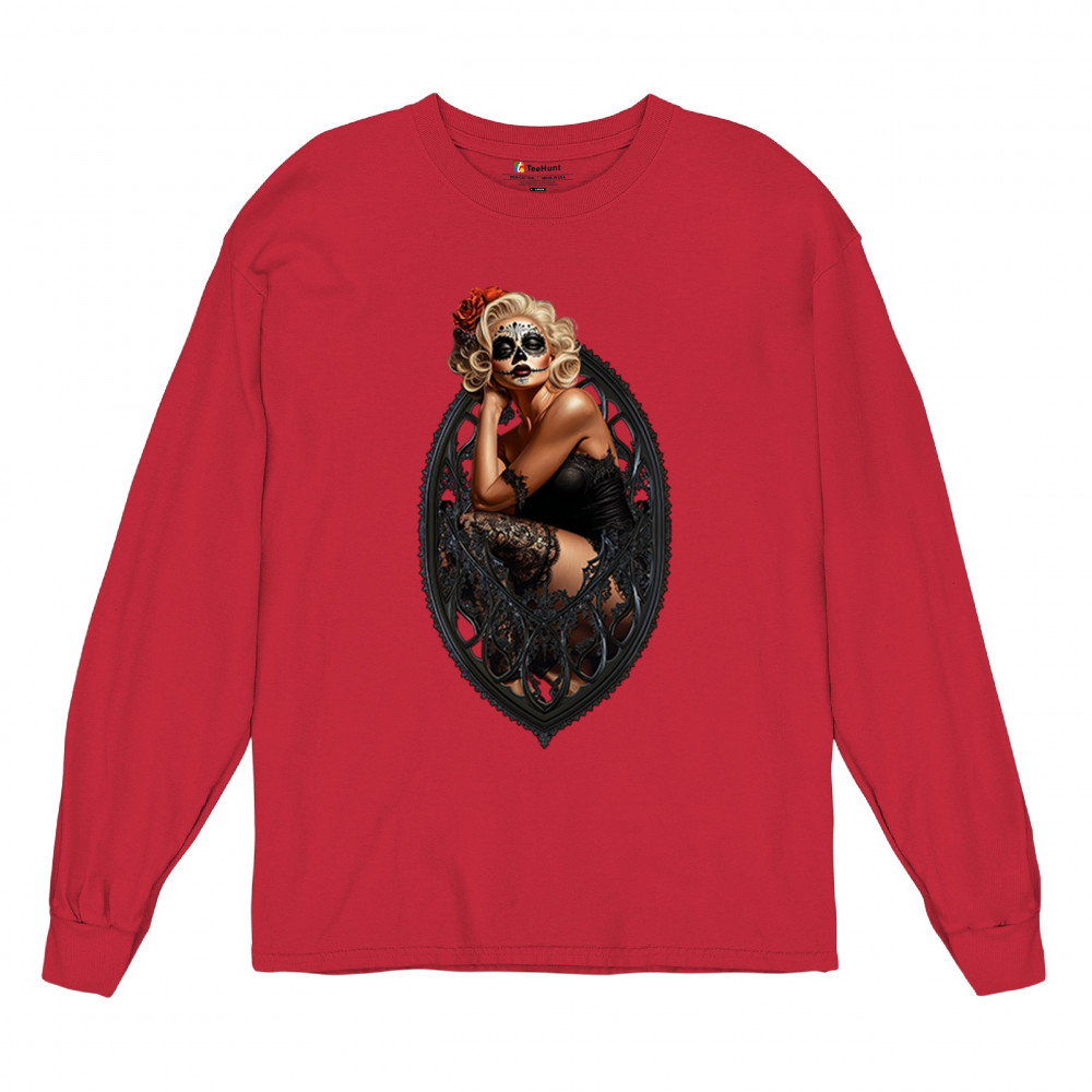 This sultry sugar skull pinup design blends gothic lace, seductive pose, and ornate frame detail for a bold Day of the Dead tribute. With striking makeup and vintage lingerie styling, it’s perfect for fans of macabre fashion, calavera art, and dark romance. A hauntingly beautiful mix of allure, attitude, and Dia de los Muertos charm.