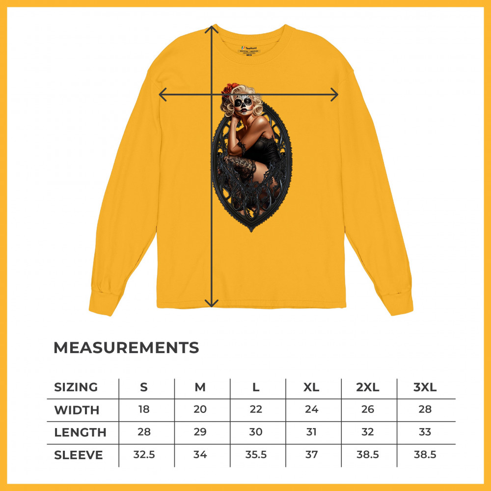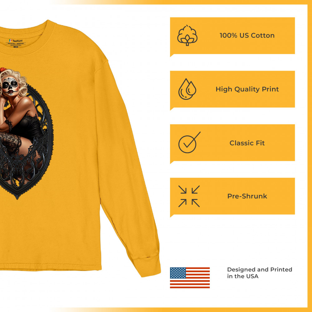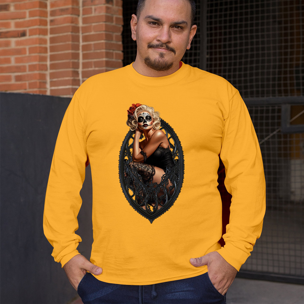 This sultry sugar skull pinup design blends gothic lace, seductive pose, and ornate frame detail for a bold Day of the Dead tribute. With striking makeup and vintage lingerie styling, it’s perfect for fans of macabre fashion, calavera art, and dark romance. A hauntingly beautiful mix of allure, attitude, and Dia de los Muertos charm.