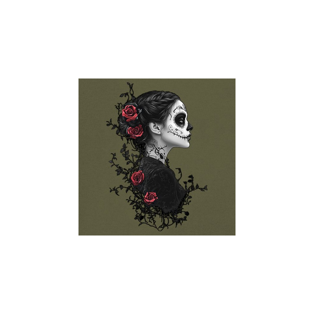 Celebrate Dia de los Muertos in style with this refined sugar skull woman design. Featuring a side profile view, vibrant red roses, and dark gothic floral elements, it creates a graceful balance between mystery and beauty. Ideal for fans of macabre art, skull themes, and honoring ancestral traditions through elegant visuals.