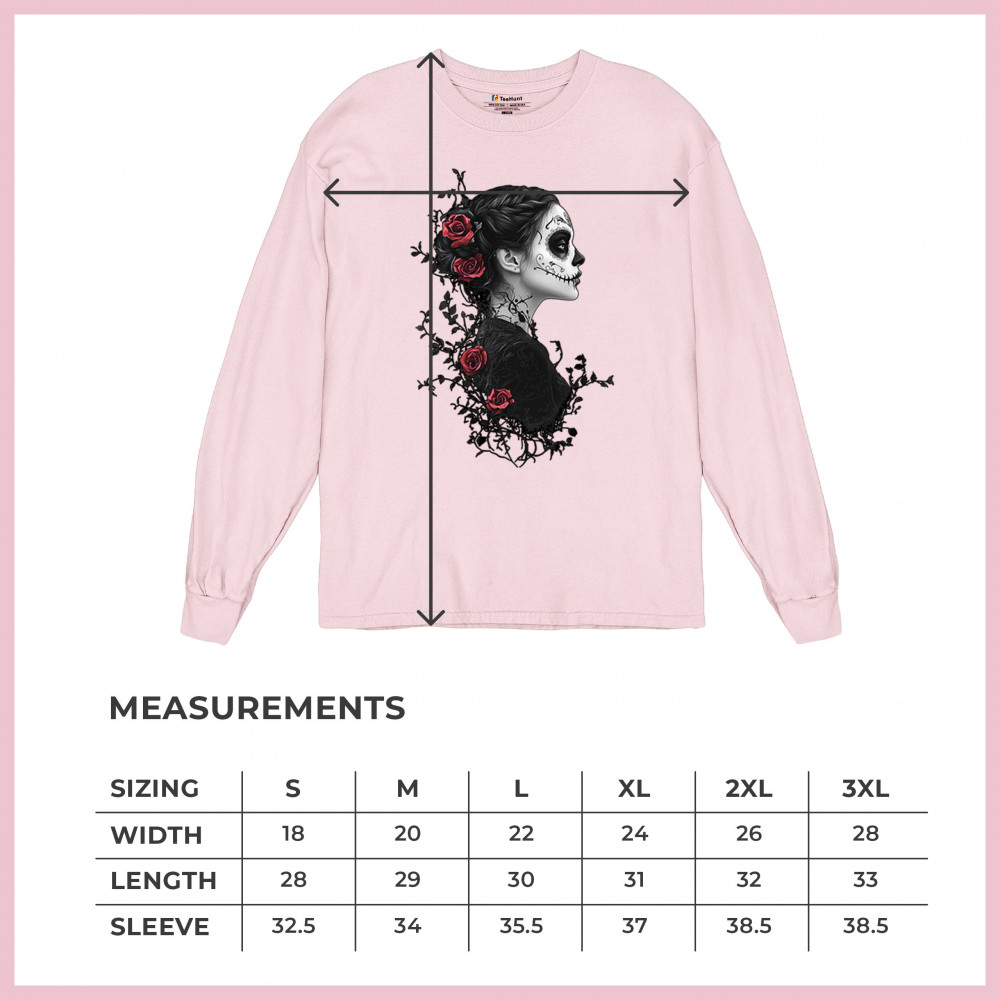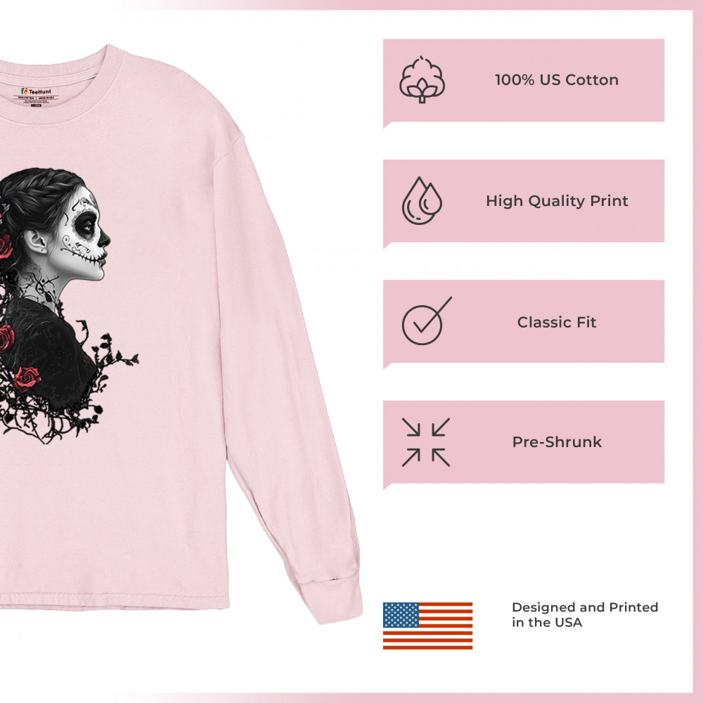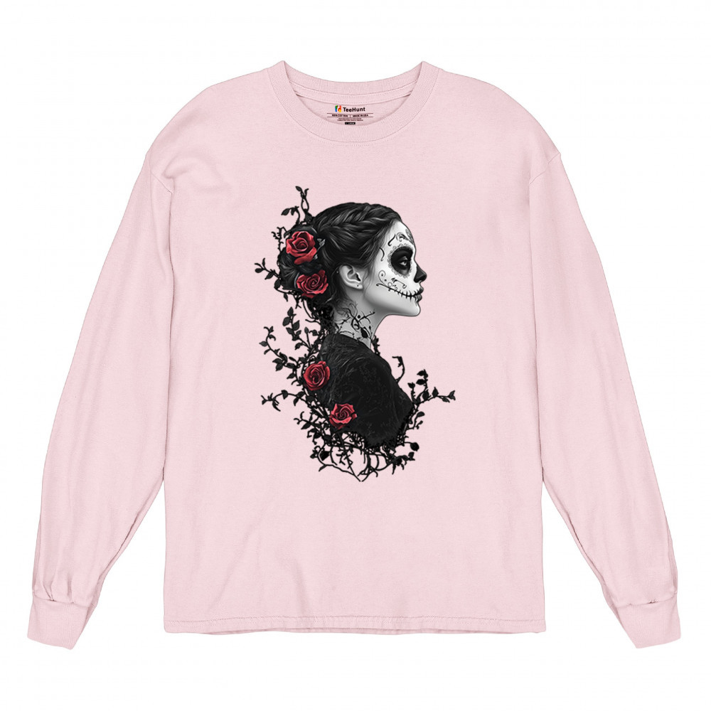 Celebrate Dia de los Muertos in style with this refined sugar skull woman design. Featuring a side profile view, vibrant red roses, and dark gothic floral elements, it creates a graceful balance between mystery and beauty. Ideal for fans of macabre art, skull themes, and honoring ancestral traditions through elegant visuals.
