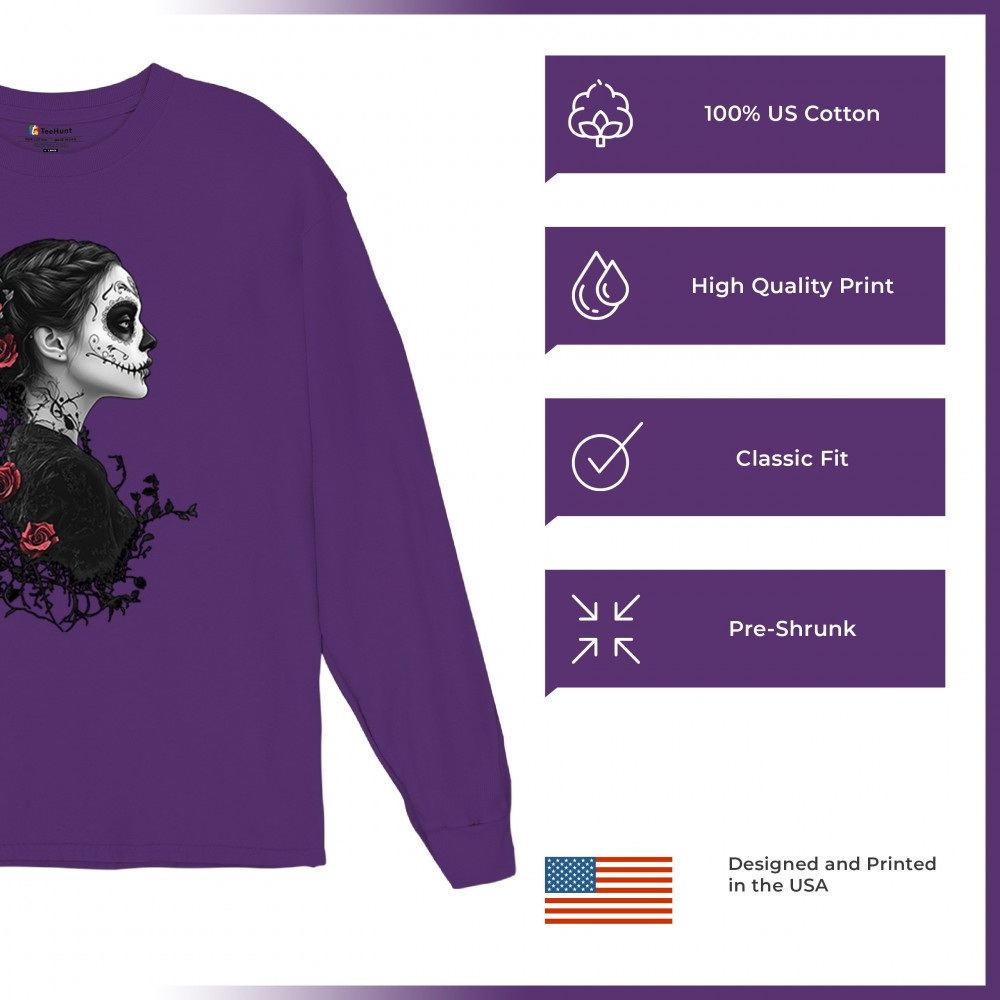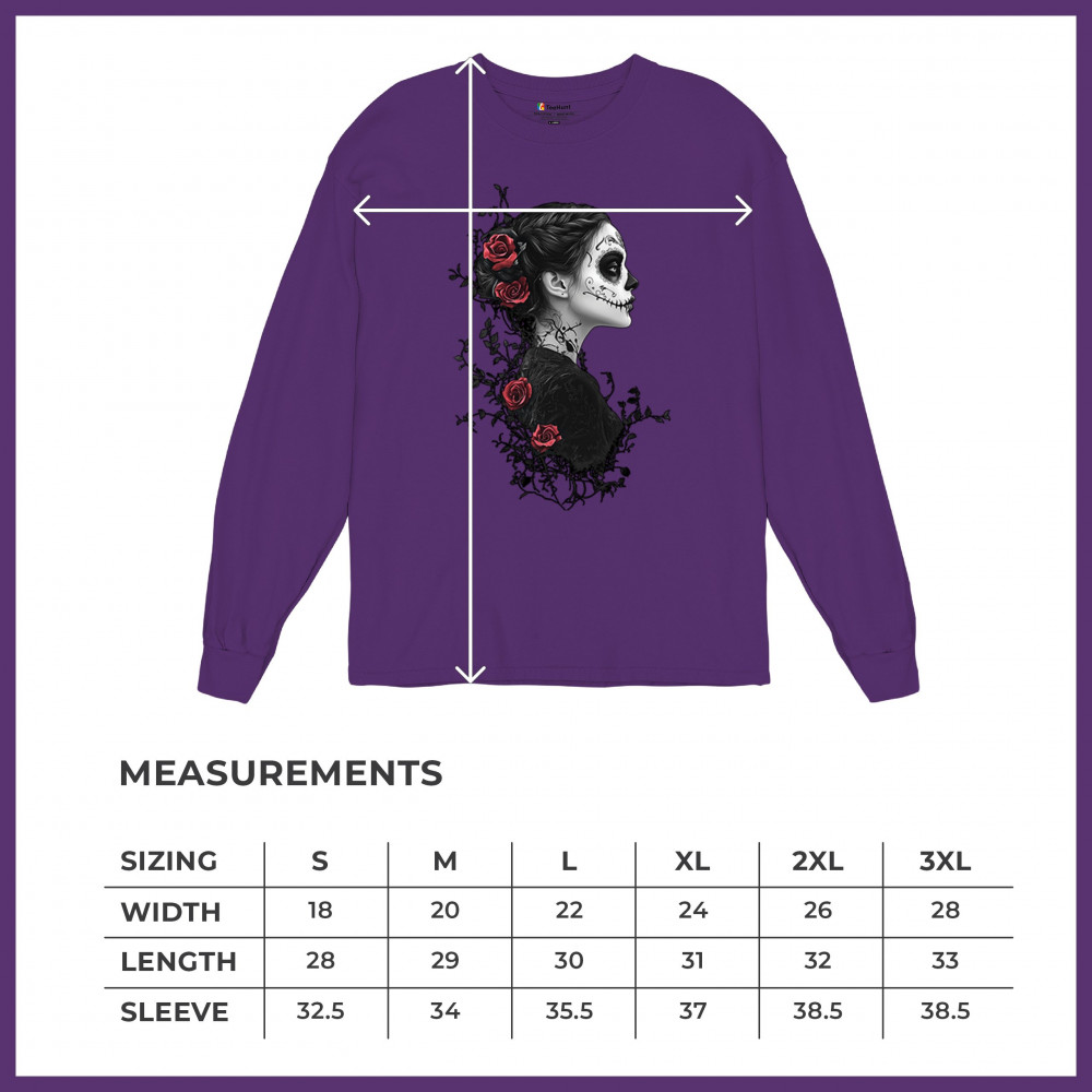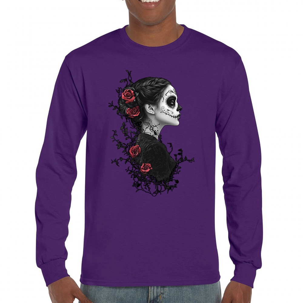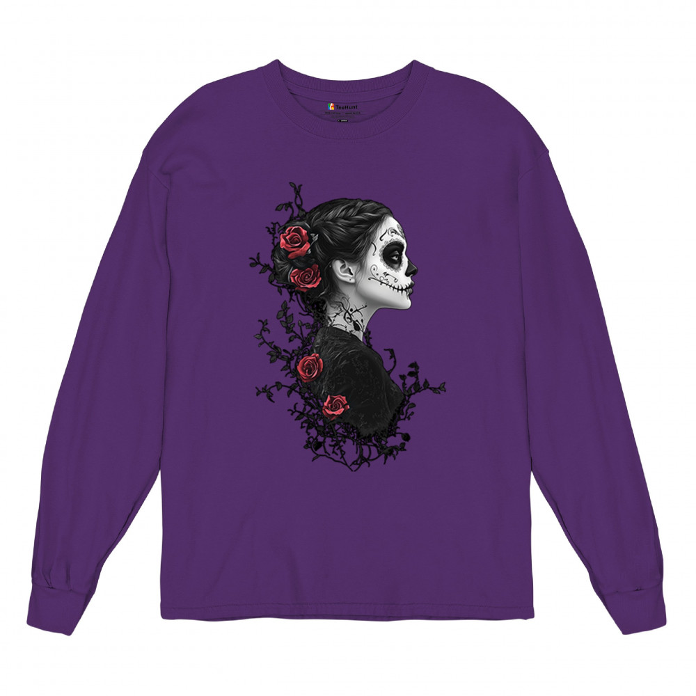Celebrate Dia de los Muertos in style with this refined sugar skull woman design. Featuring a side profile view, vibrant red roses, and dark gothic floral elements, it creates a graceful balance between mystery and beauty. Ideal for fans of macabre art, skull themes, and honoring ancestral traditions through elegant visuals.