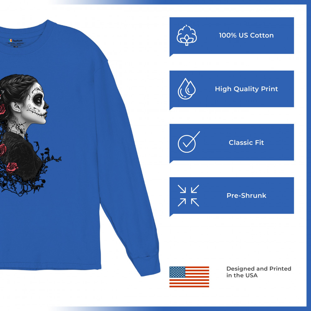 Celebrate Dia de los Muertos in style with this refined sugar skull woman design. Featuring a side profile view, vibrant red roses, and dark gothic floral elements, it creates a graceful balance between mystery and beauty. Ideal for fans of macabre art, skull themes, and honoring ancestral traditions through elegant visuals.