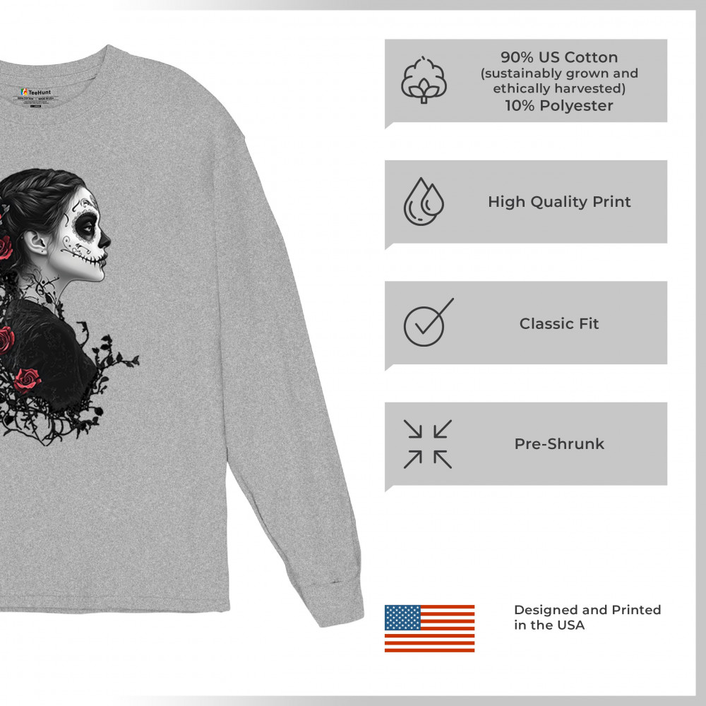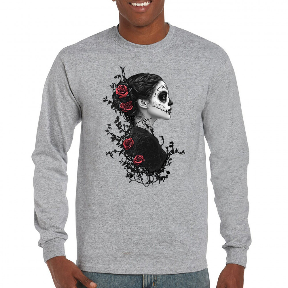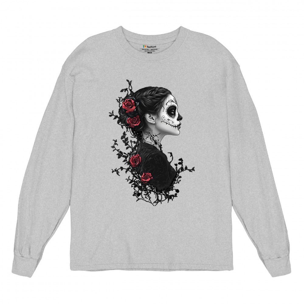Celebrate Dia de los Muertos in style with this refined sugar skull woman design. Featuring a side profile view, vibrant red roses, and dark gothic floral elements, it creates a graceful balance between mystery and beauty. Ideal for fans of macabre art, skull themes, and honoring ancestral traditions through elegant visuals.