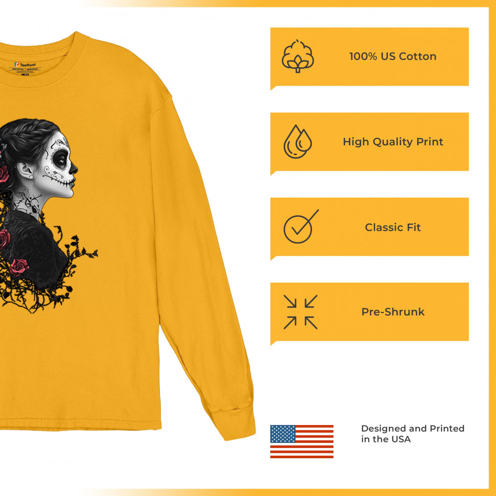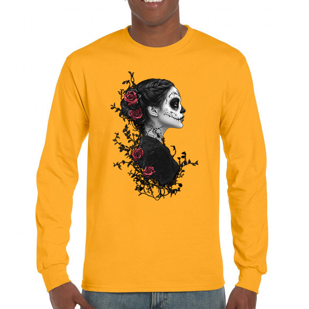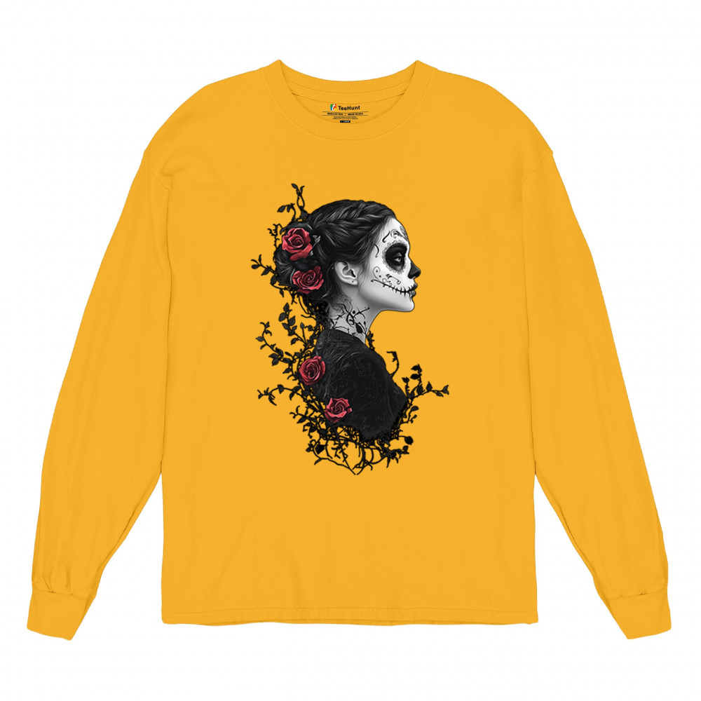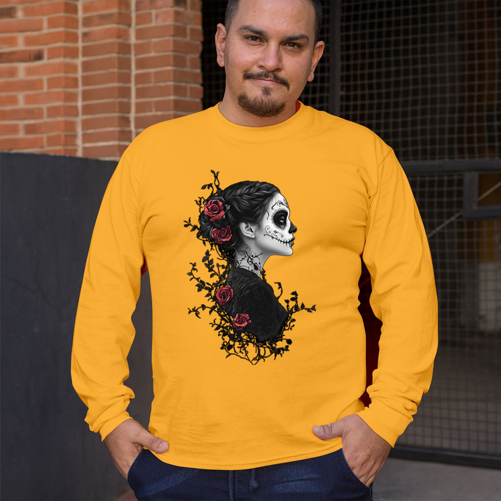 Celebrate Dia de los Muertos in style with this refined sugar skull woman design. Featuring a side profile view, vibrant red roses, and dark gothic floral elements, it creates a graceful balance between mystery and beauty. Ideal for fans of macabre art, skull themes, and honoring ancestral traditions through elegant visuals.