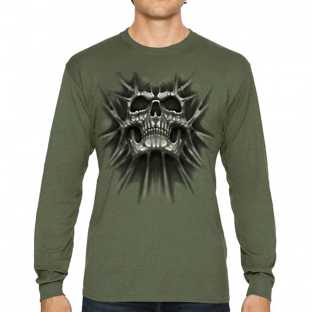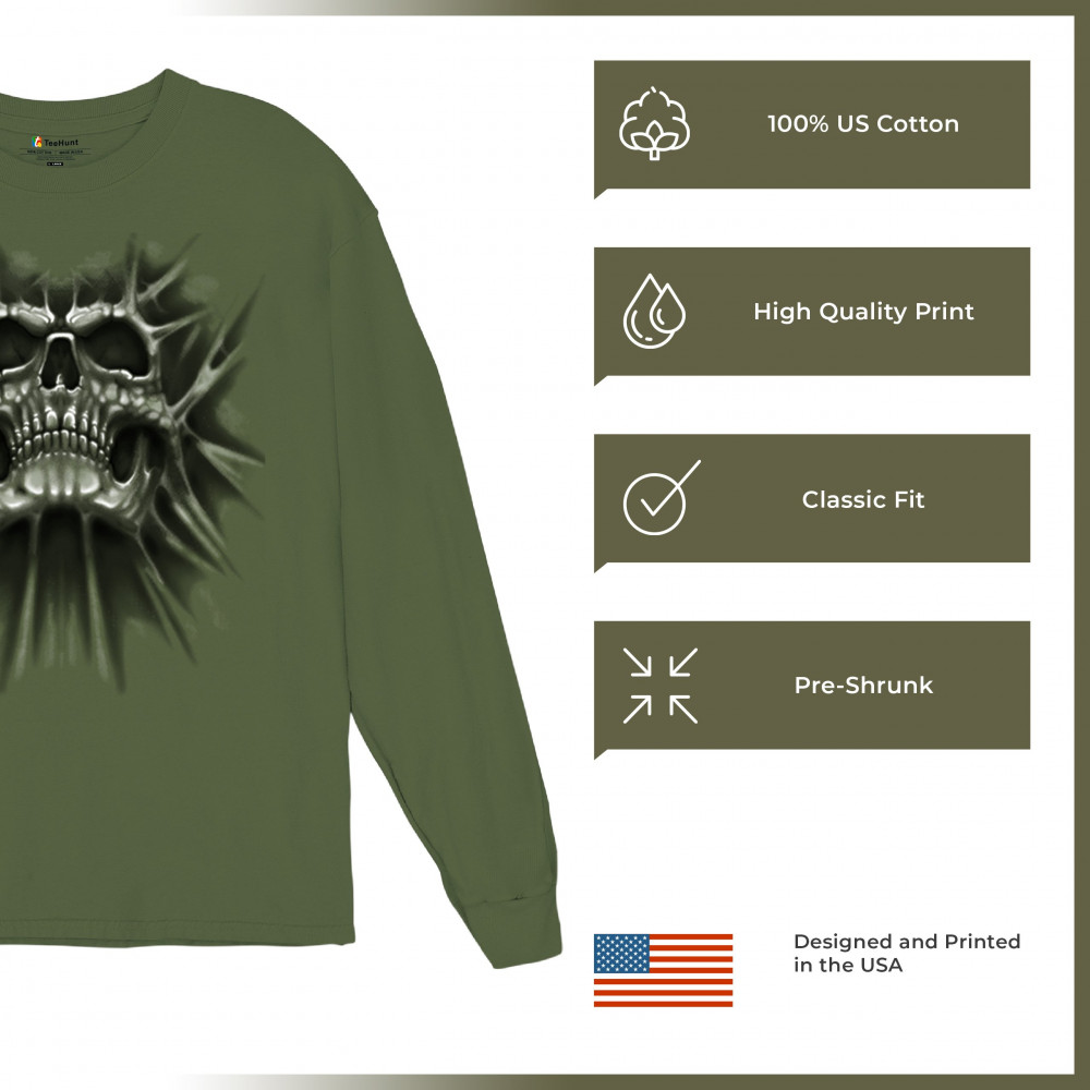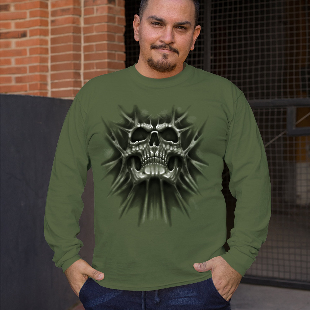 Gothic skull biker shirt with roots design. Perfect for Metalhead, Rock n Roll fans, edgy rebel fashion, and spooky Halloween vibes.