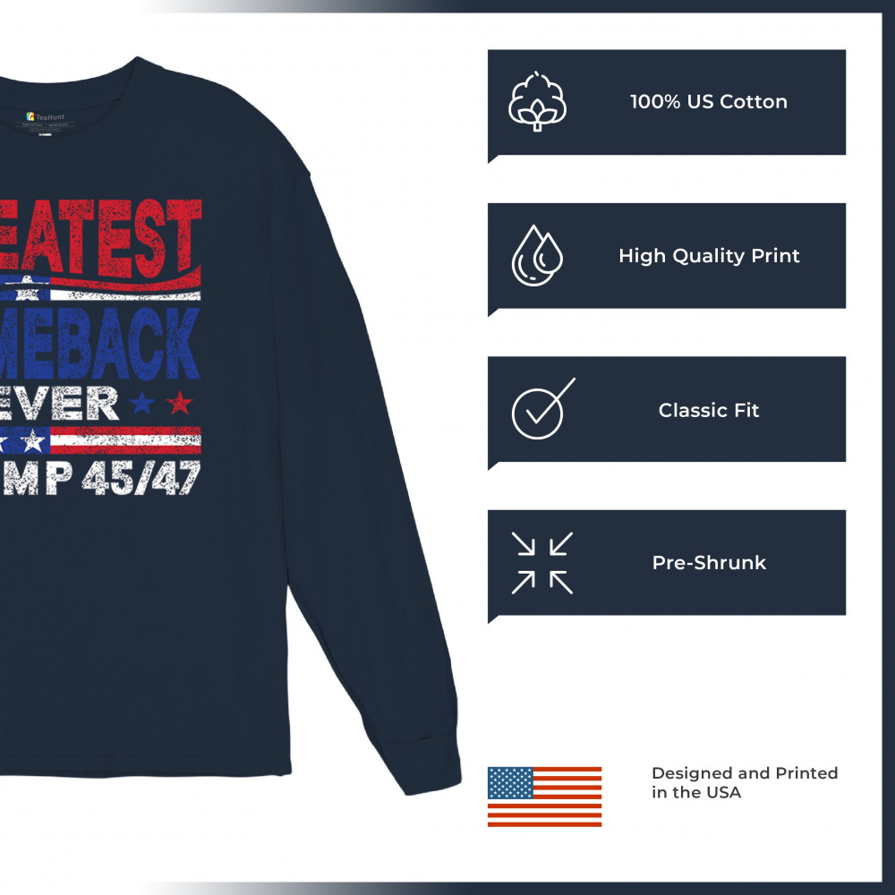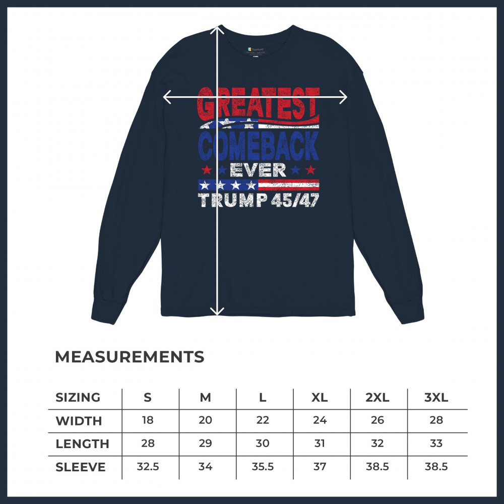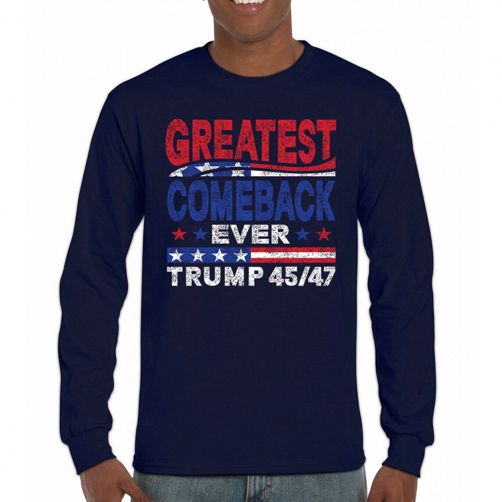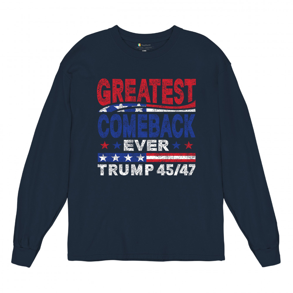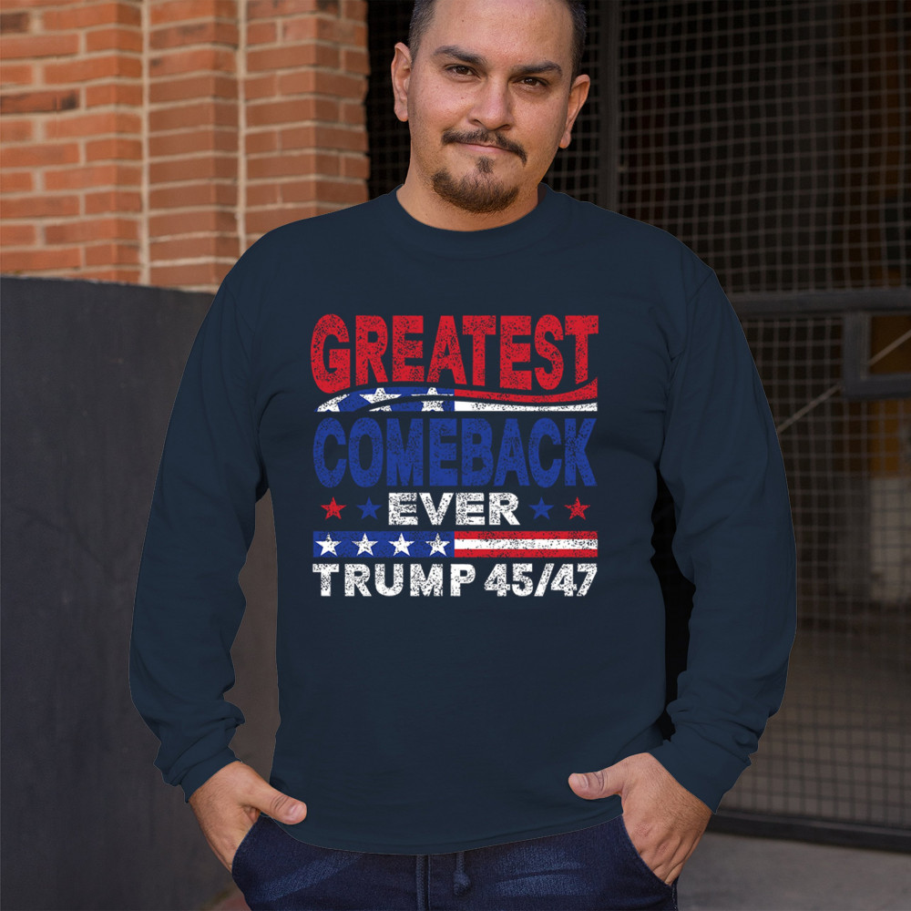 The "Greatest Comeback Ever" design is a tribute to resilience, patriotism, and the fight for American values. Featuring bold patriotic colors and a slogan that embodies the spirit of victory, this design is perfect for Trump supporters and conservatives who believe in never surrendering. Celebrate the leadership of Donald J. Trump as the 45th and 47th president and join the movement for America's future.