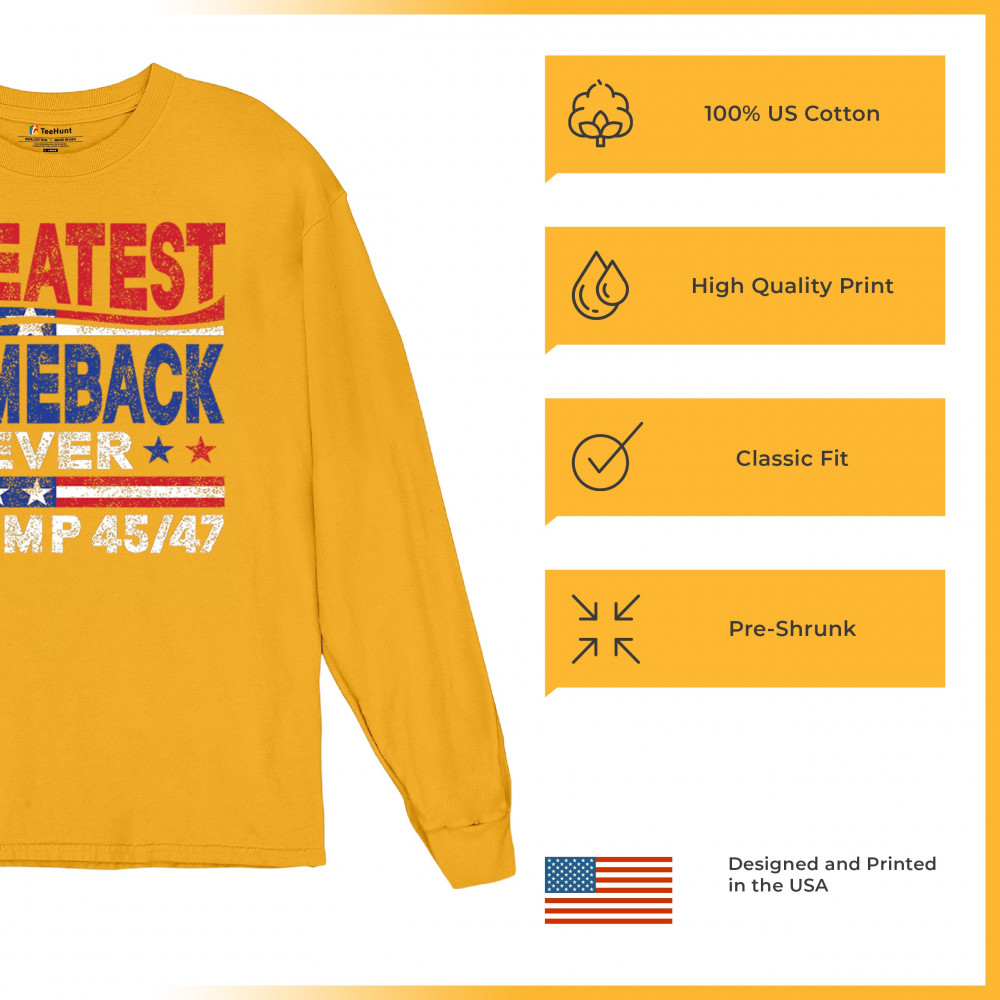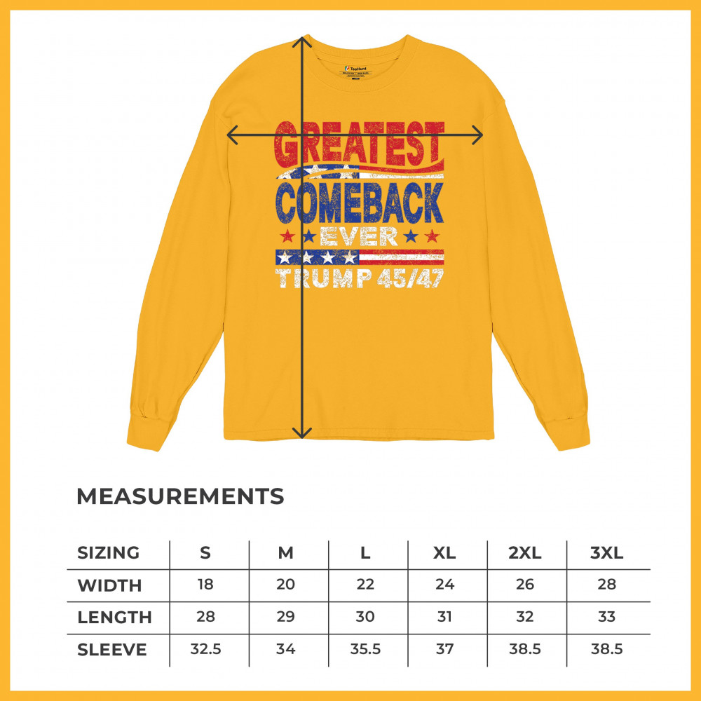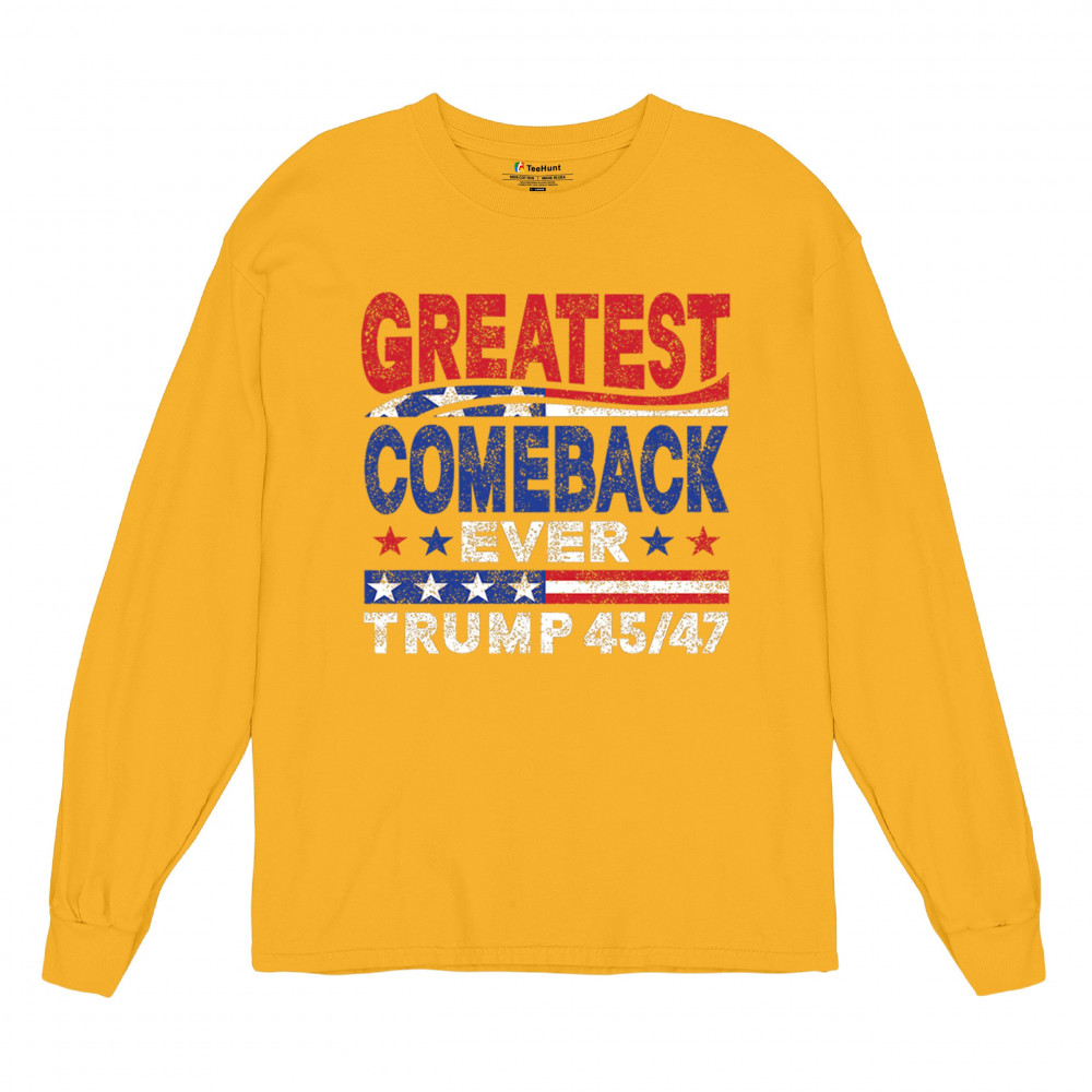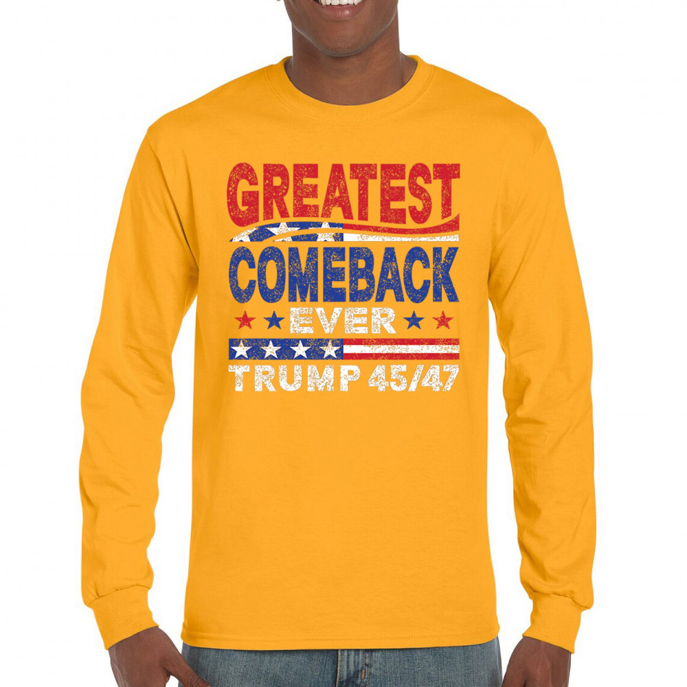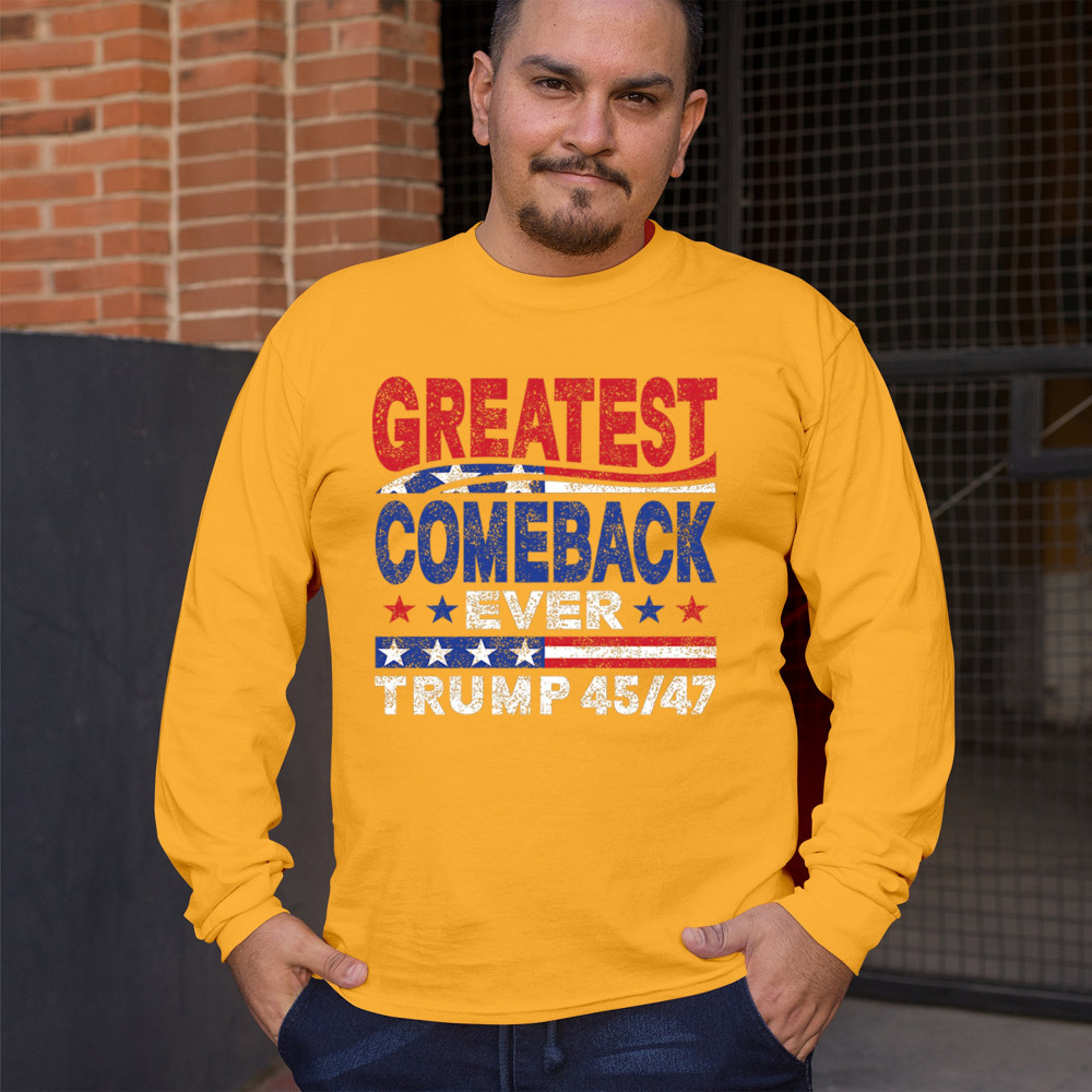 The "Greatest Comeback Ever" design is a tribute to resilience, patriotism, and the fight for American values. Featuring bold patriotic colors and a slogan that embodies the spirit of victory, this design is perfect for Trump supporters and conservatives who believe in never surrendering. Celebrate the leadership of Donald J. Trump as the 45th and 47th president and join the movement for America's future.