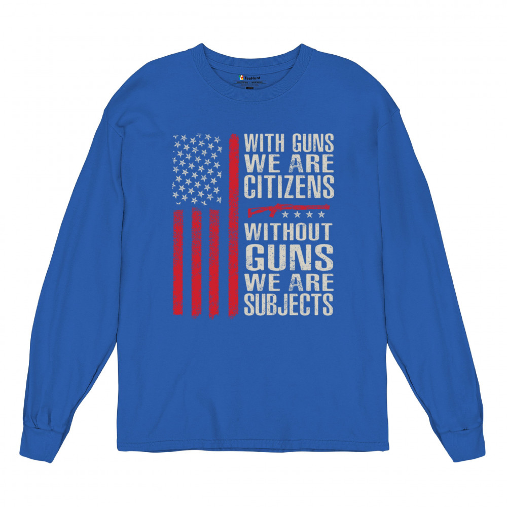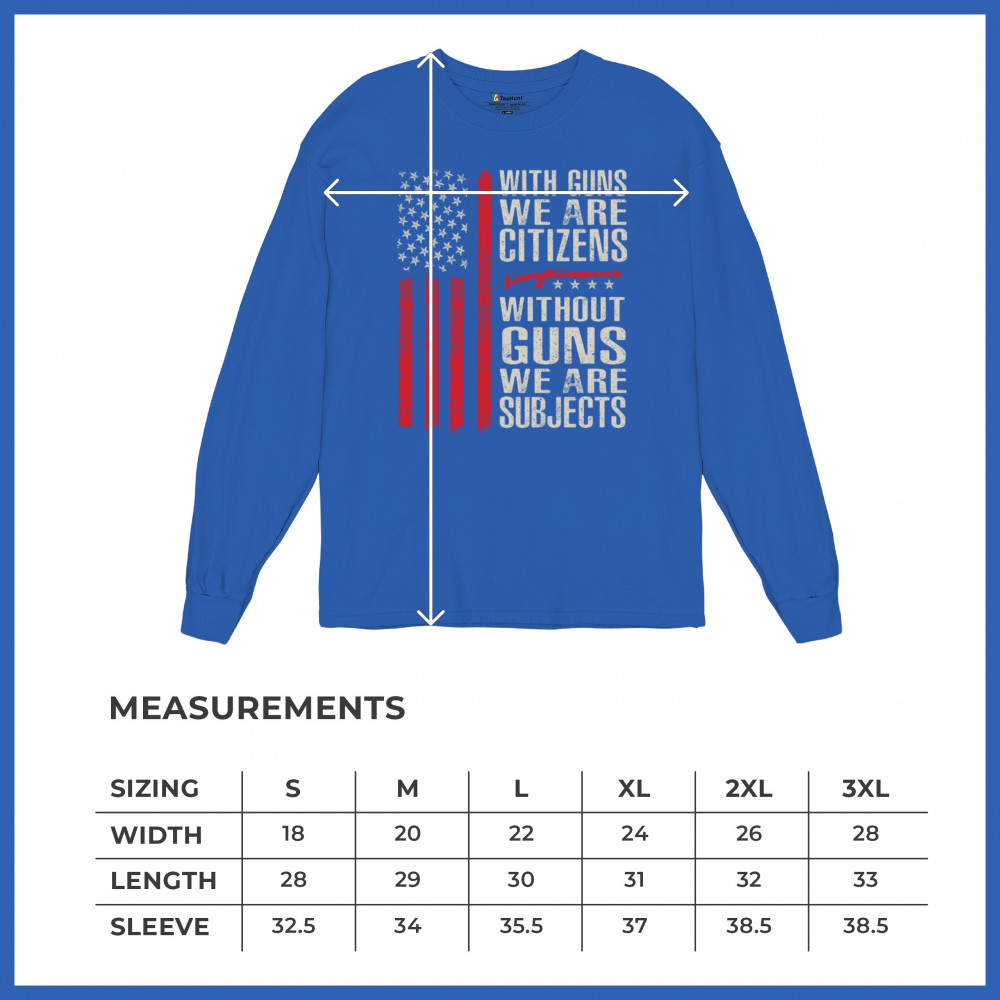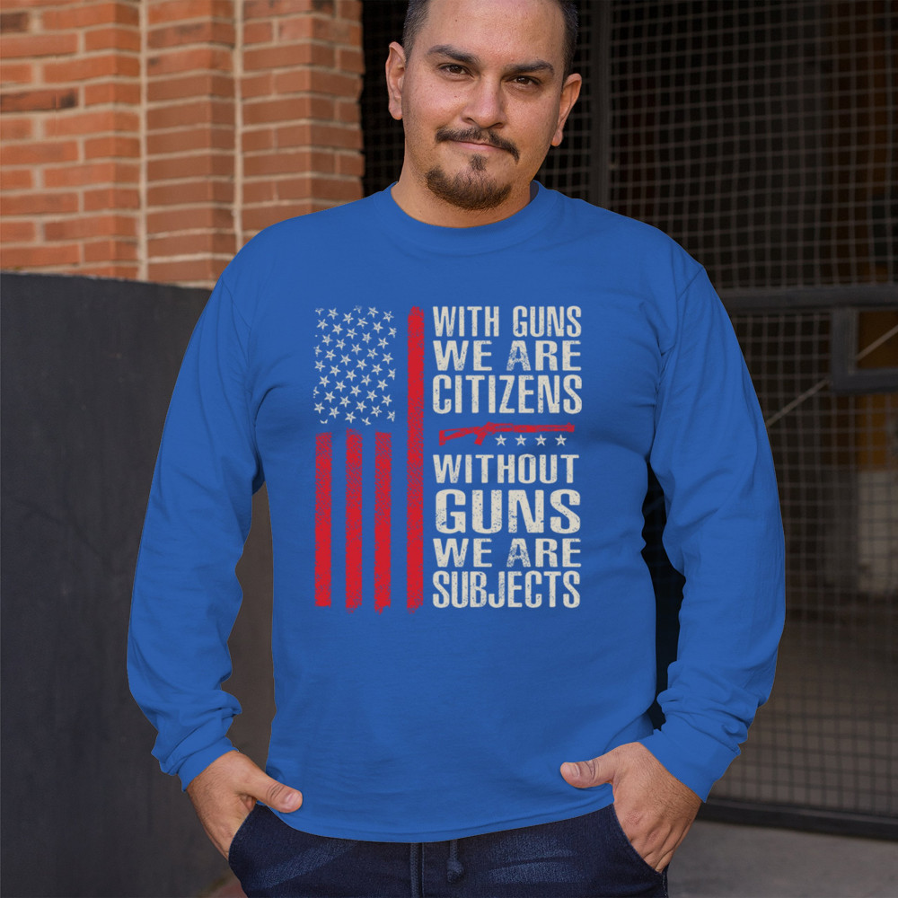 Make your voice heard with this powerful pro-2A design featuring an AR-15 graphic and distressed red American flag. The quote “With Guns We Are Citizens, Without Guns We Are Subjects†speaks directly to the heart of liberty and personal defense. A must-have for patriots, protestors, and gun rights supporters who defend the Constitution.