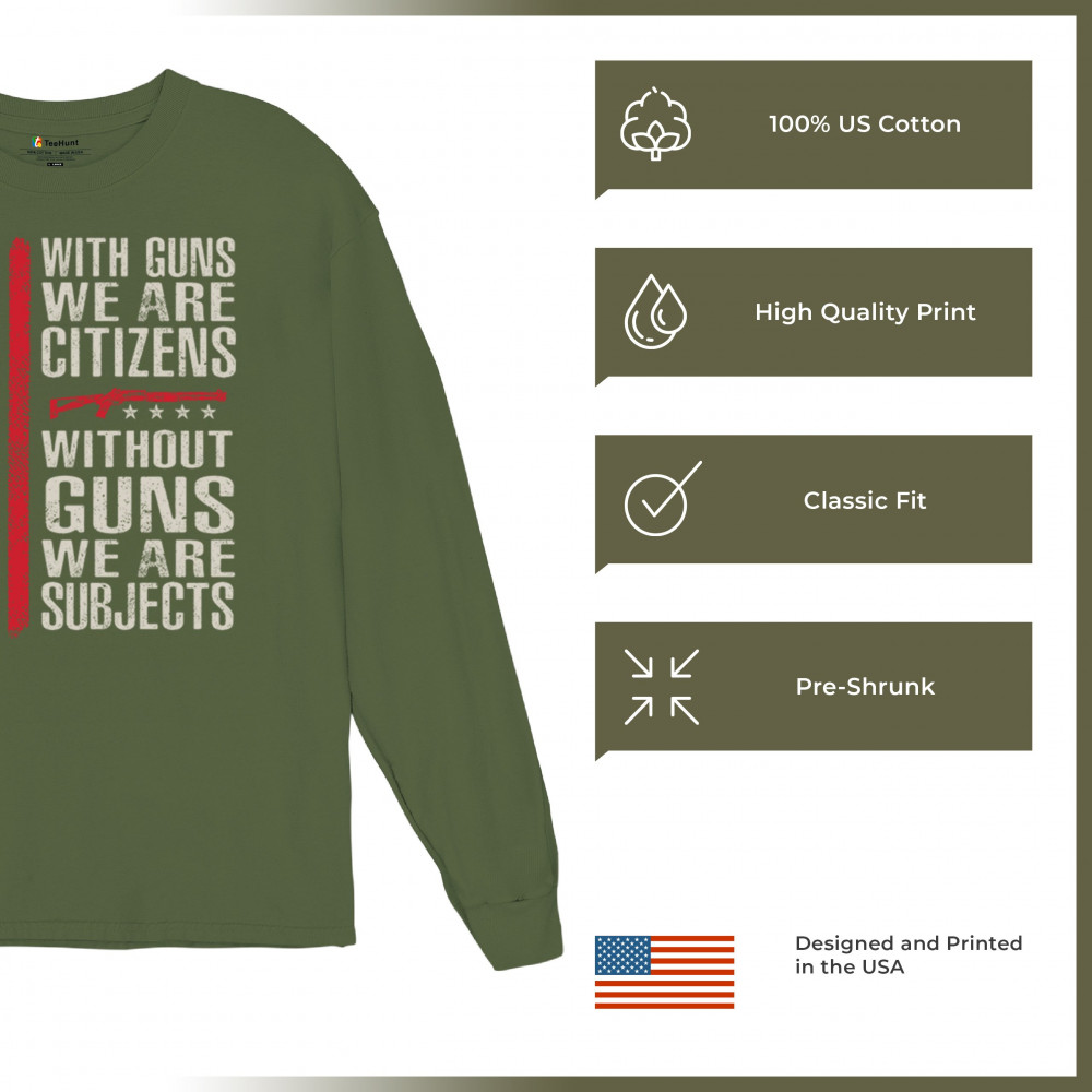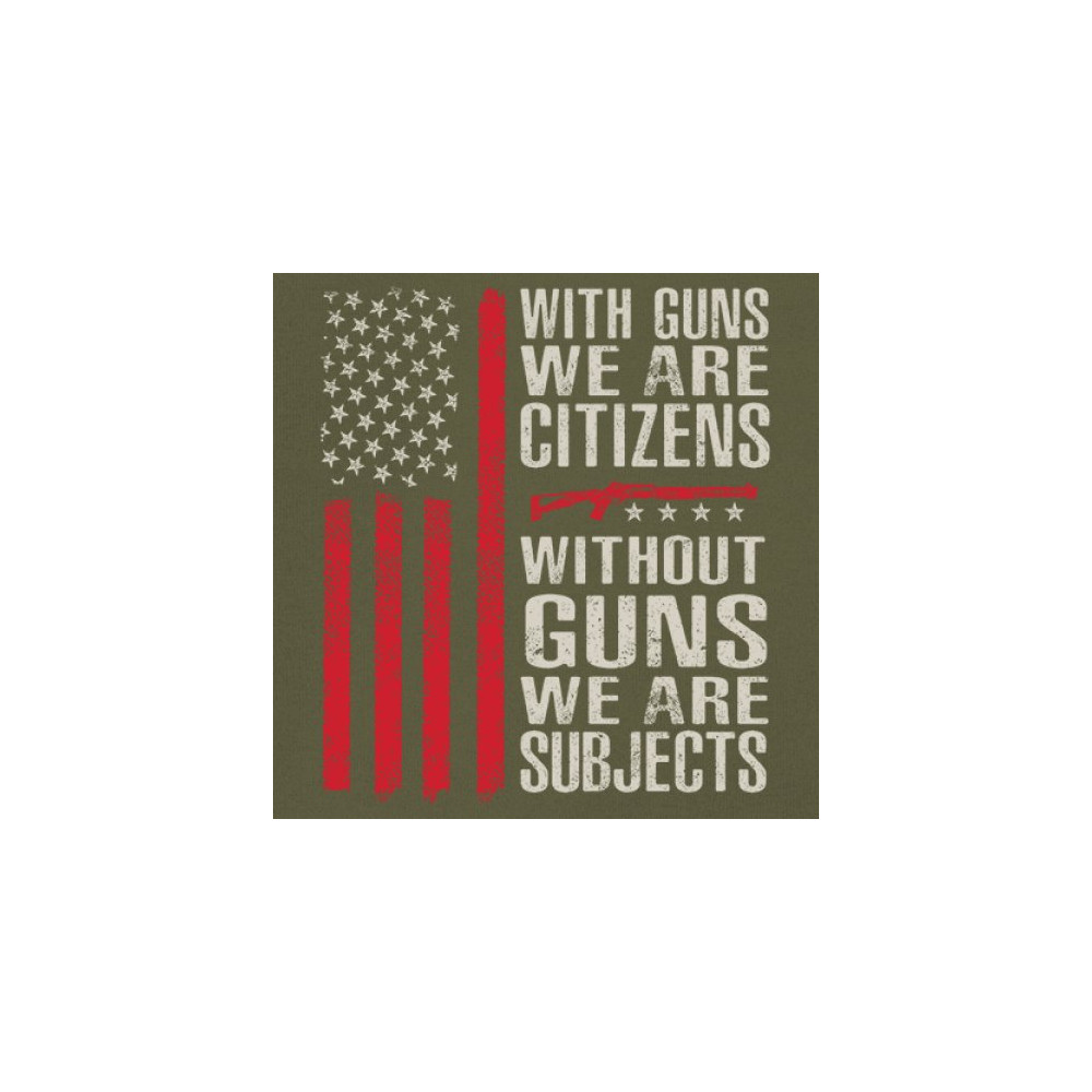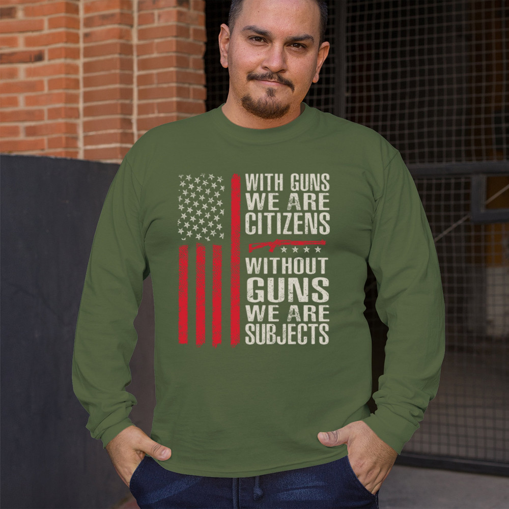 Make your voice heard with this powerful pro-2A design featuring an AR-15 graphic and distressed red American flag. The quote “With Guns We Are Citizens, Without Guns We Are Subjects†speaks directly to the heart of liberty and personal defense. A must-have for patriots, protestors, and gun rights supporters who defend the Constitution.