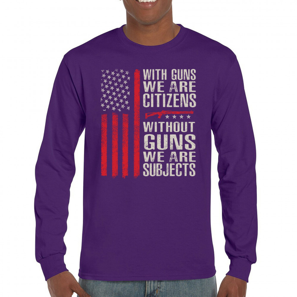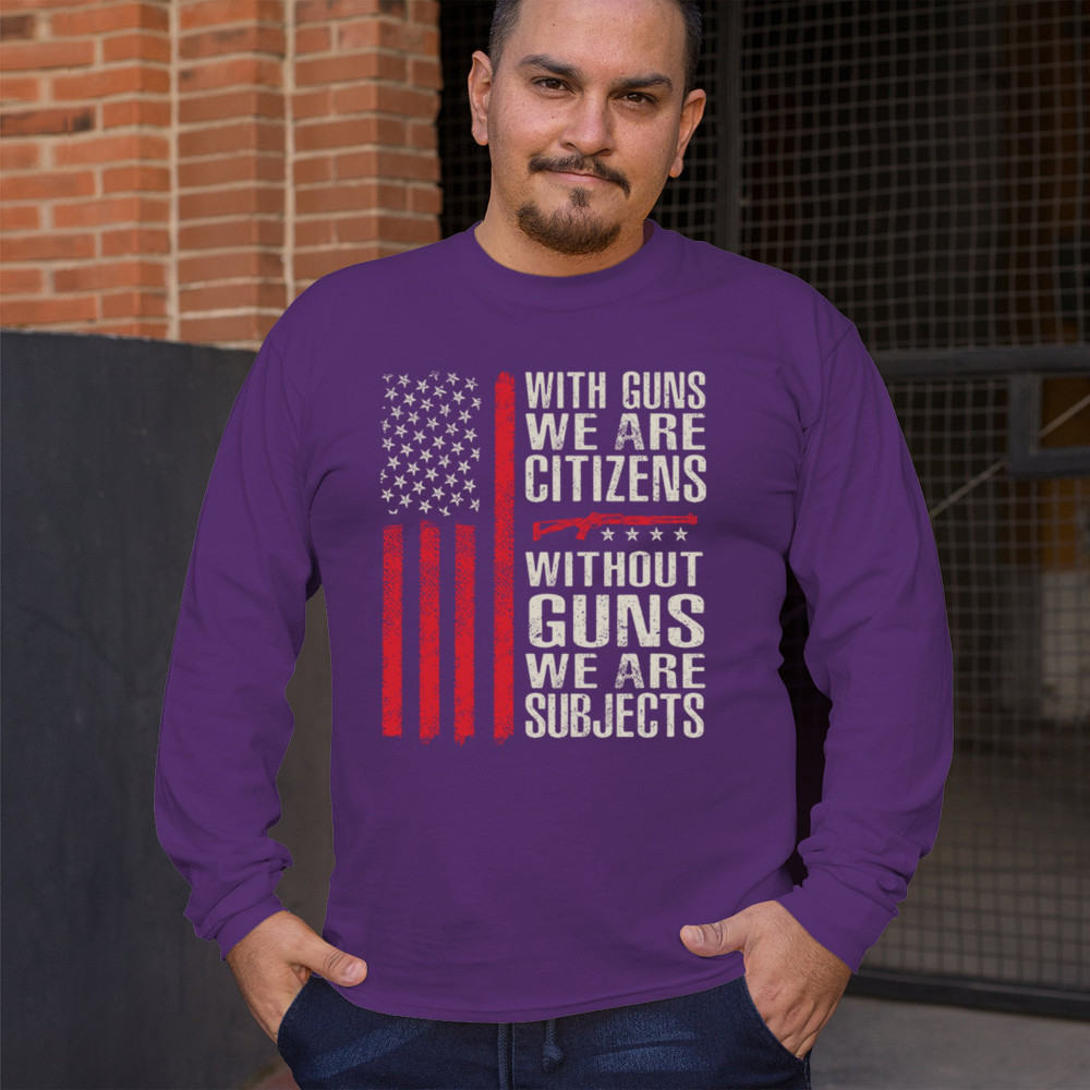 Make your voice heard with this powerful pro-2A design featuring an AR-15 graphic and distressed red American flag. The quote “With Guns We Are Citizens, Without Guns We Are Subjects†speaks directly to the heart of liberty and personal defense. A must-have for patriots, protestors, and gun rights supporters who defend the Constitution.