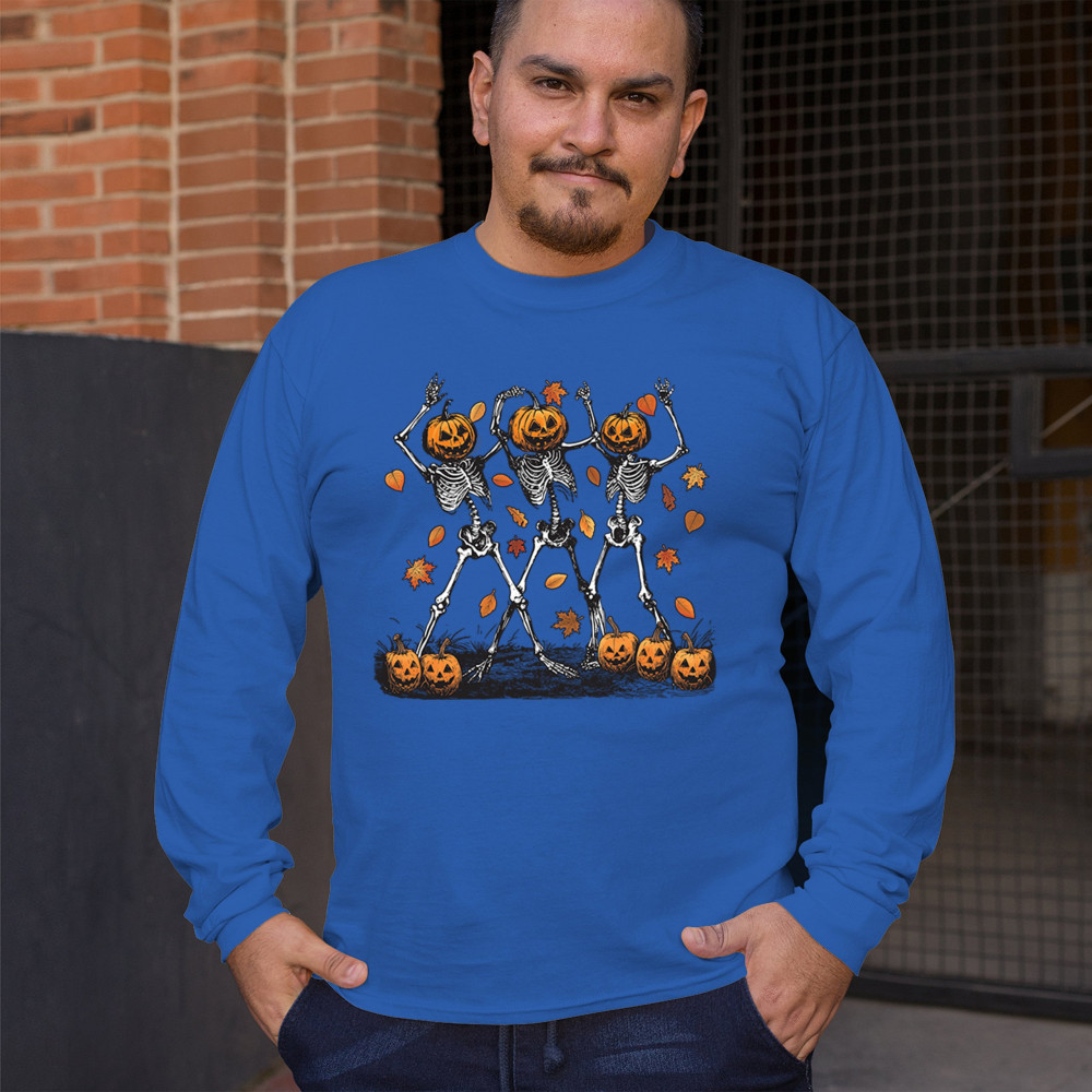 Add a touch of spooky fun to your wardrobe with this lively design featuring pumpkin-headed skeletons dancing through a swirl of autumn leaves. Perfect for Halloween parties, trick-or-treating, and fall festivals, this design is a must-have for anyone who enjoys the whimsical side of the spooky season. Made with comfort and quality in mind, this is the perfect apparel for all your October gatherings and events. Wear it to show off your Halloween spirit!