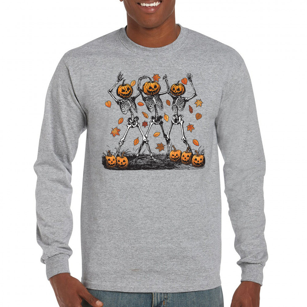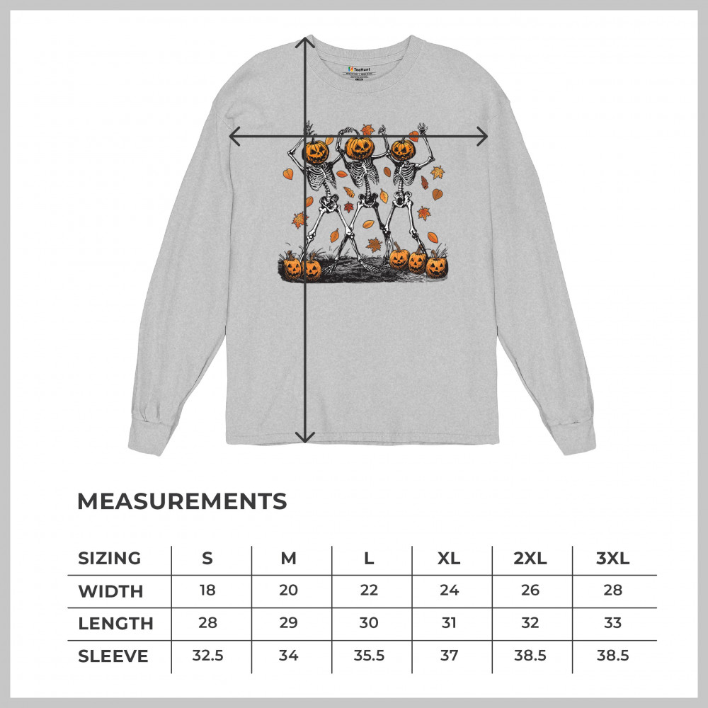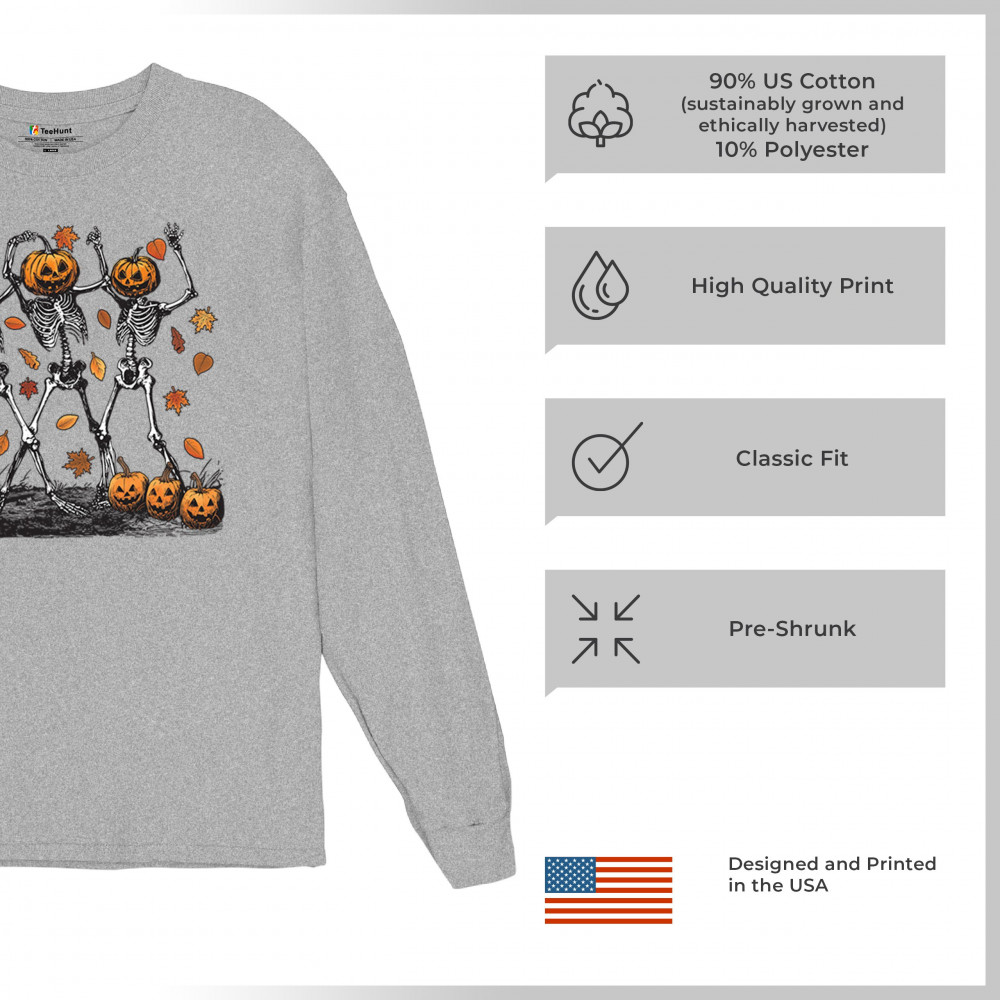 Add a touch of spooky fun to your wardrobe with this lively design featuring pumpkin-headed skeletons dancing through a swirl of autumn leaves. Perfect for Halloween parties, trick-or-treating, and fall festivals, this design is a must-have for anyone who enjoys the whimsical side of the spooky season. Made with comfort and quality in mind, this is the perfect apparel for all your October gatherings and events. Wear it to show off your Halloween spirit!