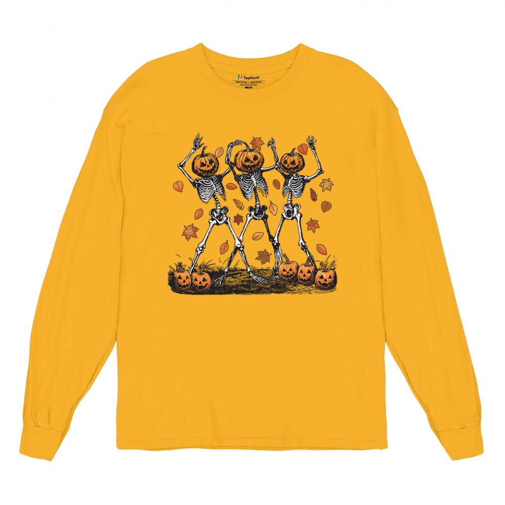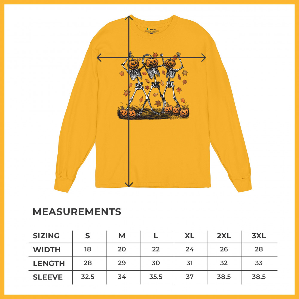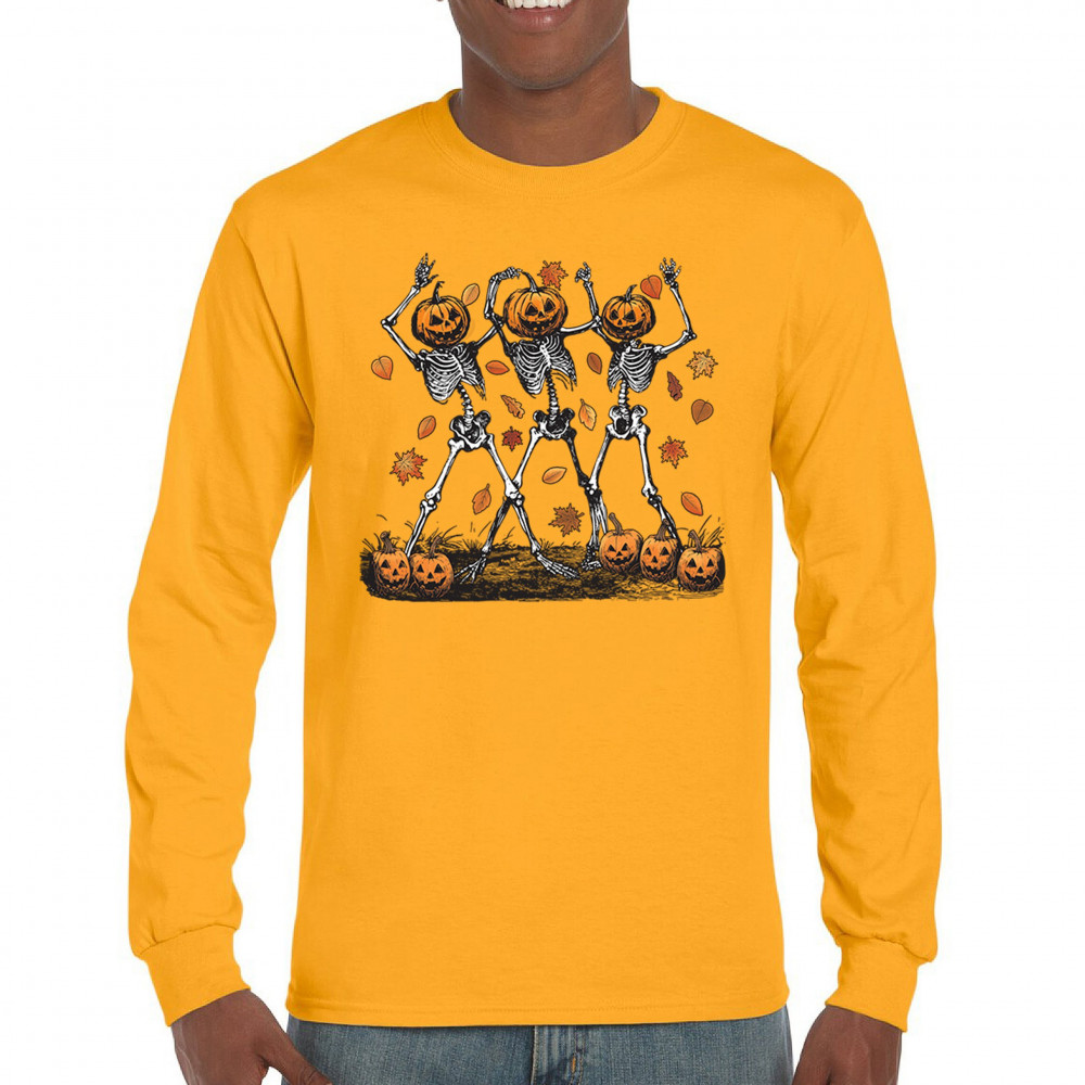 Add a touch of spooky fun to your wardrobe with this lively design featuring pumpkin-headed skeletons dancing through a swirl of autumn leaves. Perfect for Halloween parties, trick-or-treating, and fall festivals, this design is a must-have for anyone who enjoys the whimsical side of the spooky season. Made with comfort and quality in mind, this is the perfect apparel for all your October gatherings and events. Wear it to show off your Halloween spirit!