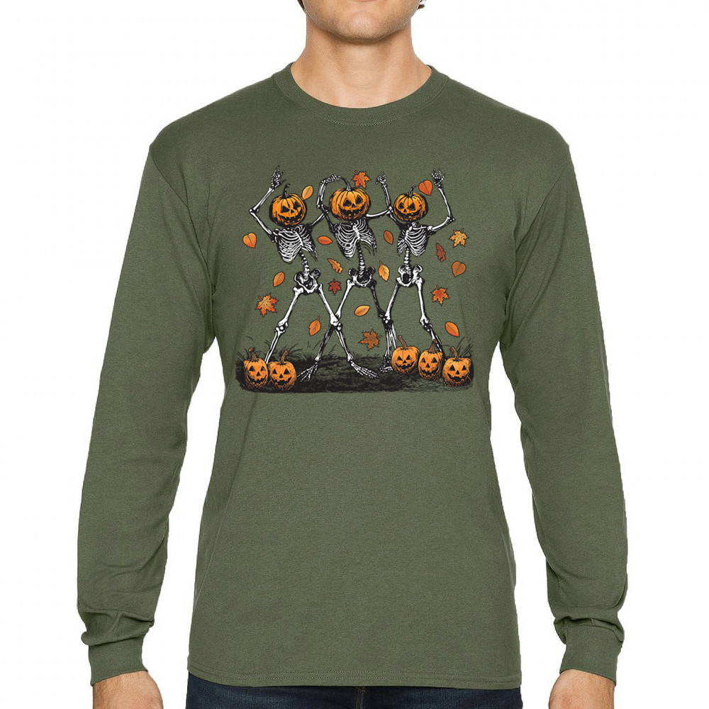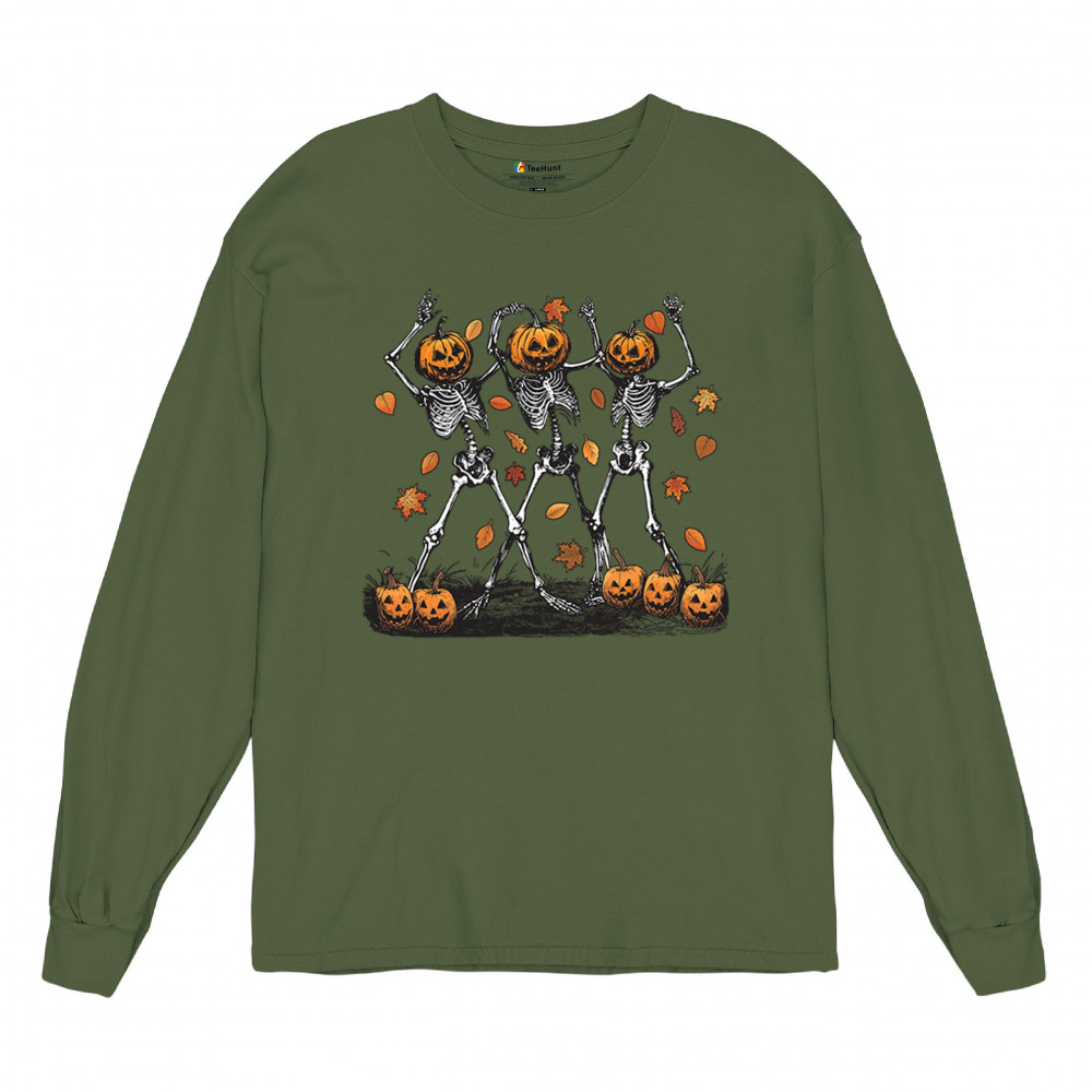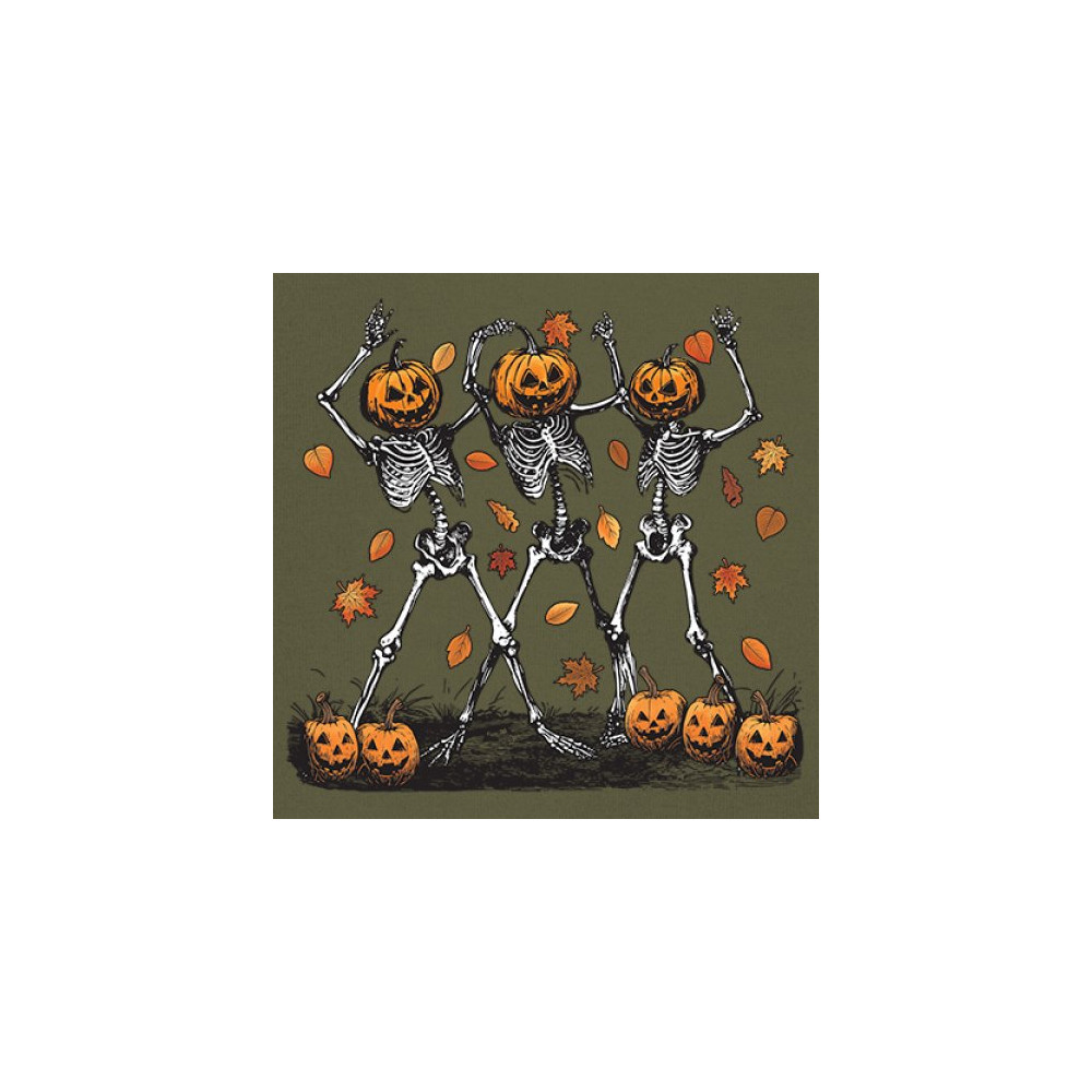 Add a touch of spooky fun to your wardrobe with this lively design featuring pumpkin-headed skeletons dancing through a swirl of autumn leaves. Perfect for Halloween parties, trick-or-treating, and fall festivals, this design is a must-have for anyone who enjoys the whimsical side of the spooky season. Made with comfort and quality in mind, this is the perfect apparel for all your October gatherings and events. Wear it to show off your Halloween spirit!