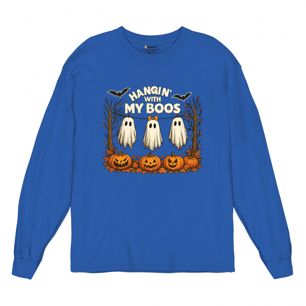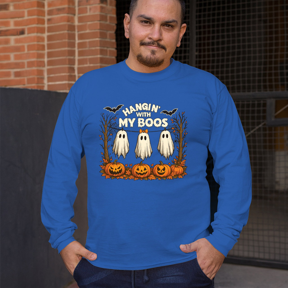 Hangin With My Boos design featuring spooky ghosts, jack o lanterns, and haunted house humor. Perfect for Halloween night, October 31, and parties.