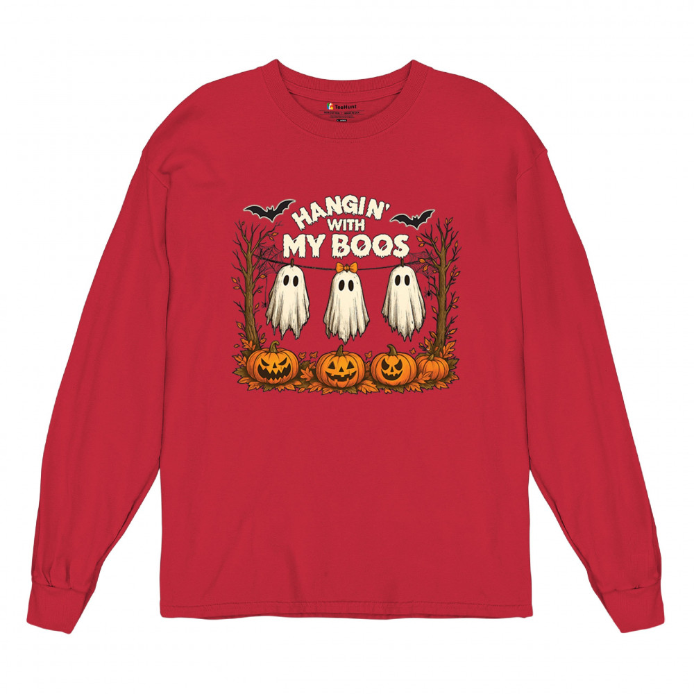 Hangin With My Boos design featuring spooky ghosts, jack o lanterns, and haunted house humor. Perfect for Halloween night, October 31, and parties.