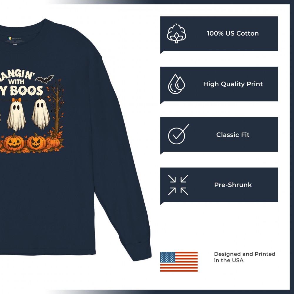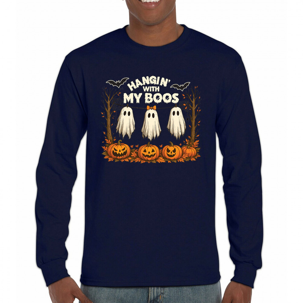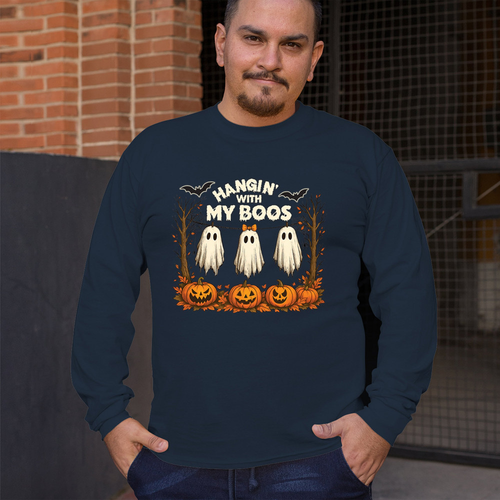 Hangin With My Boos design featuring spooky ghosts, jack o lanterns, and haunted house humor. Perfect for Halloween night, October 31, and parties.