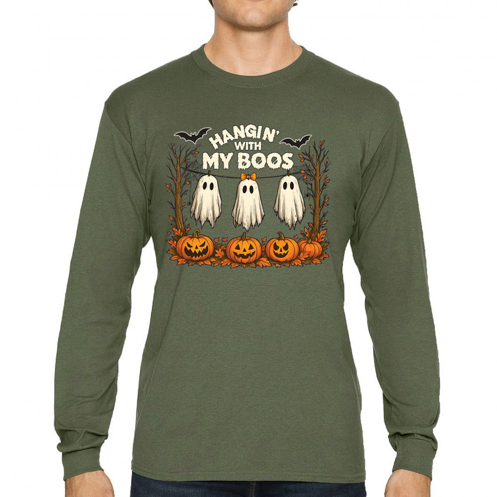 Hangin With My Boos design featuring spooky ghosts, jack o lanterns, and haunted house humor. Perfect for Halloween night, October 31, and parties.