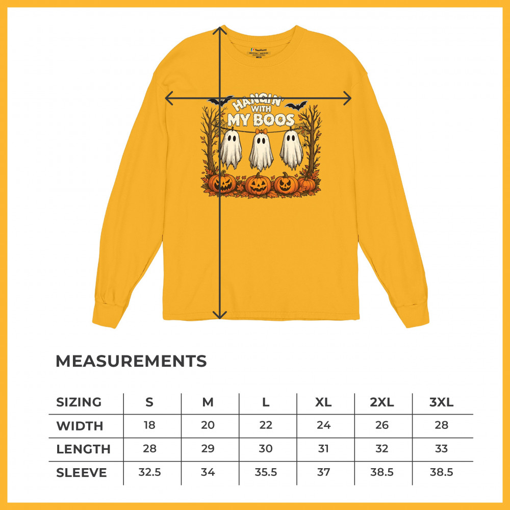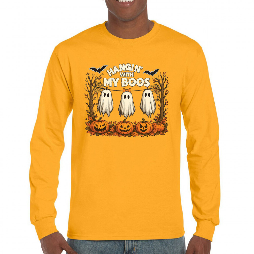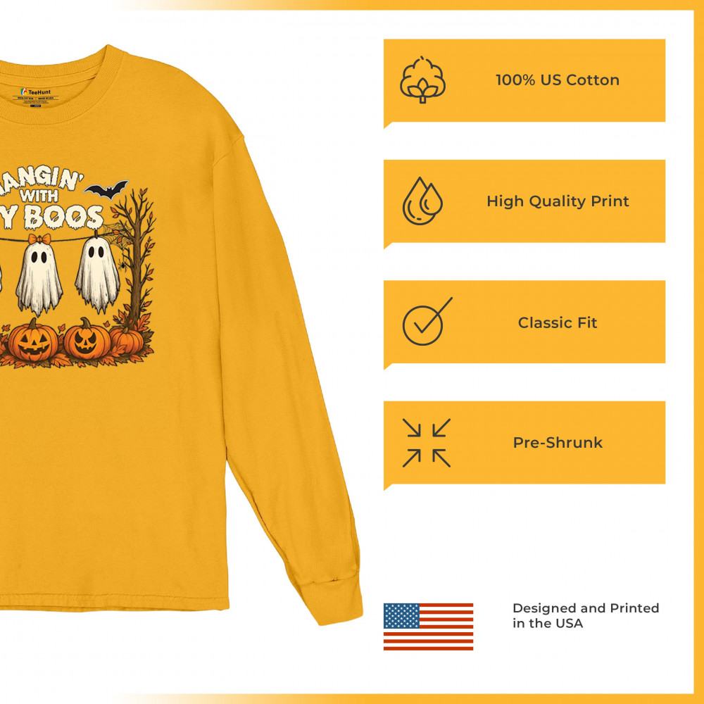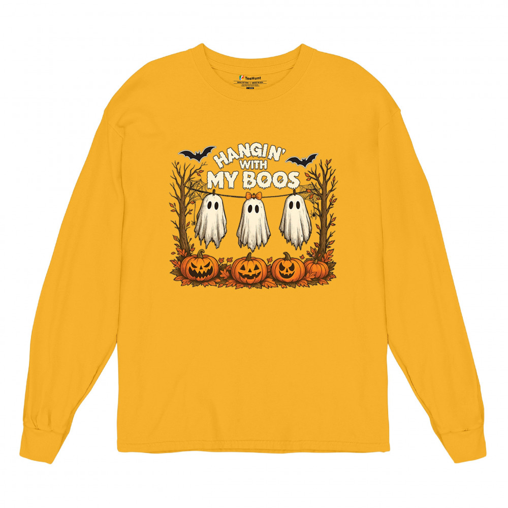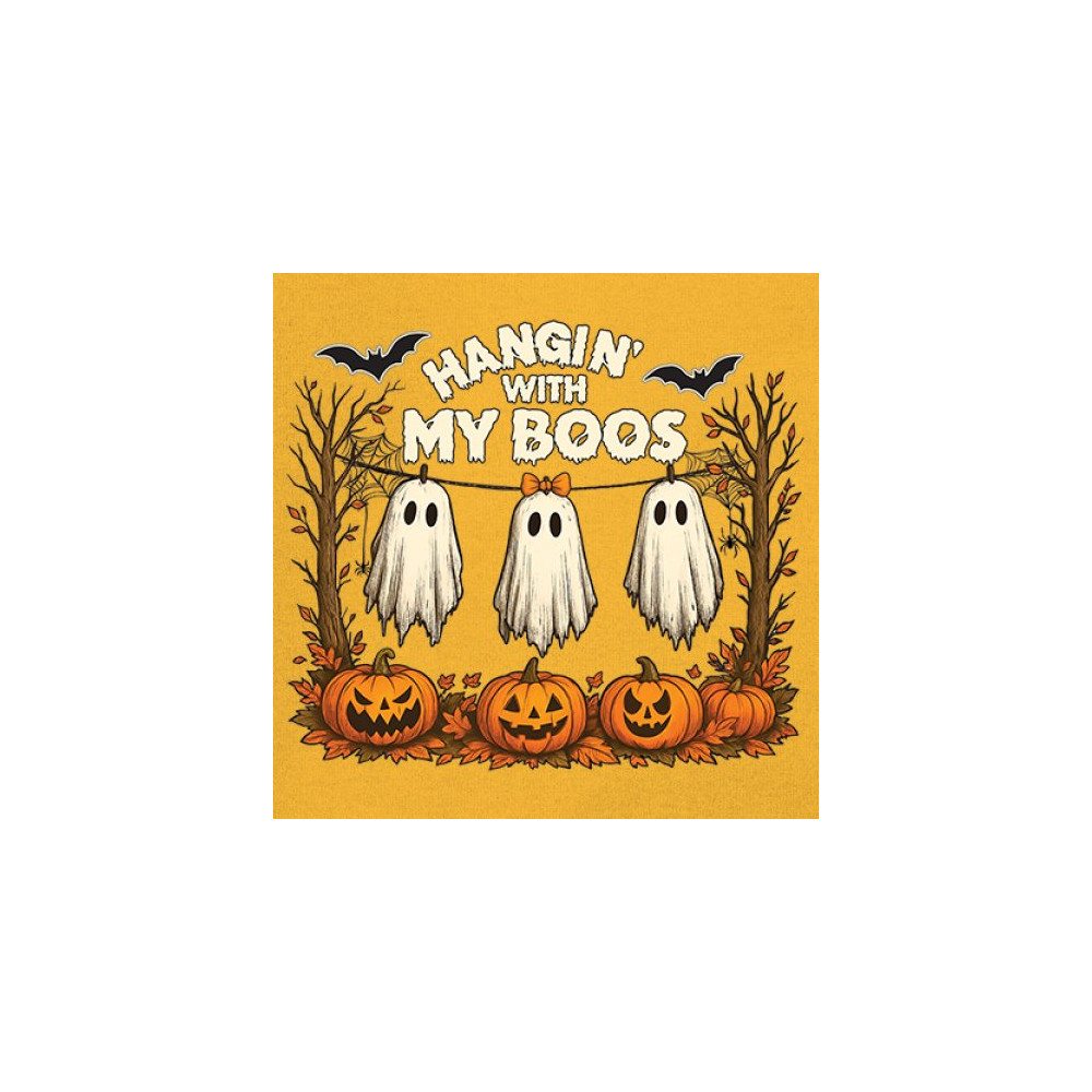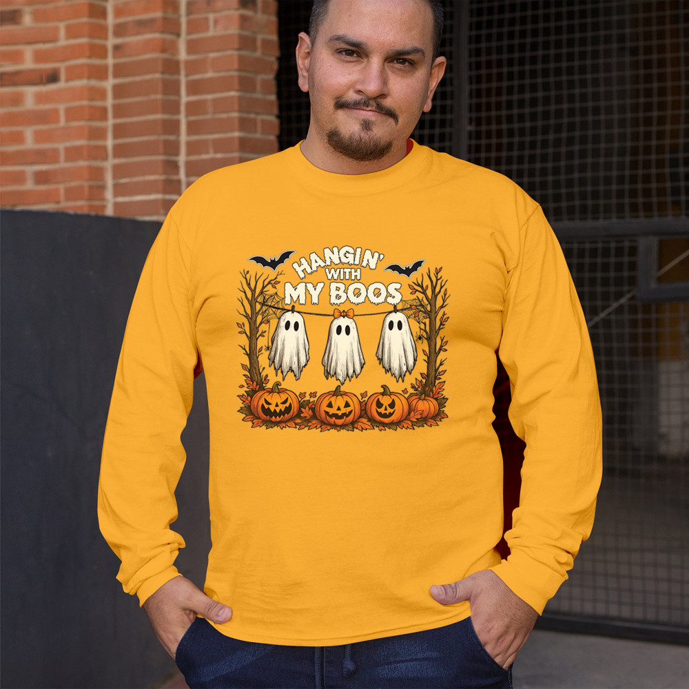 Hangin With My Boos design featuring spooky ghosts, jack o lanterns, and haunted house humor. Perfect for Halloween night, October 31, and parties.