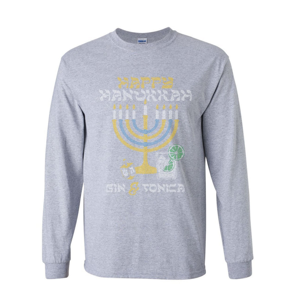 HAPPY HANUKKAH GIN & TONICA happy hanukkah long sleeve t-shirt menorah drinking gin & tonica dreidel tee gray