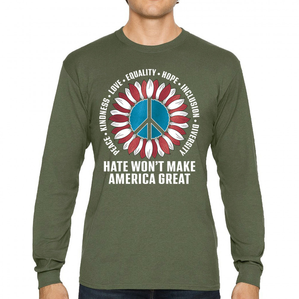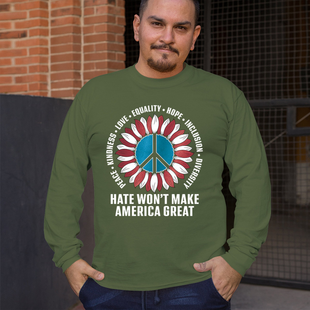 Embrace the message of love, equality, and unity with this eye-catching design. The sunflower and peace symbol represent a commitment to kindness and inclusion, rejecting hate and division. Perfect for those who support liberal values, this design is a bold statement against negativity and for a brighter future. Wear it proudly to show your belief in a diverse, united America. Let this design be a symbol of hope and progress for all.