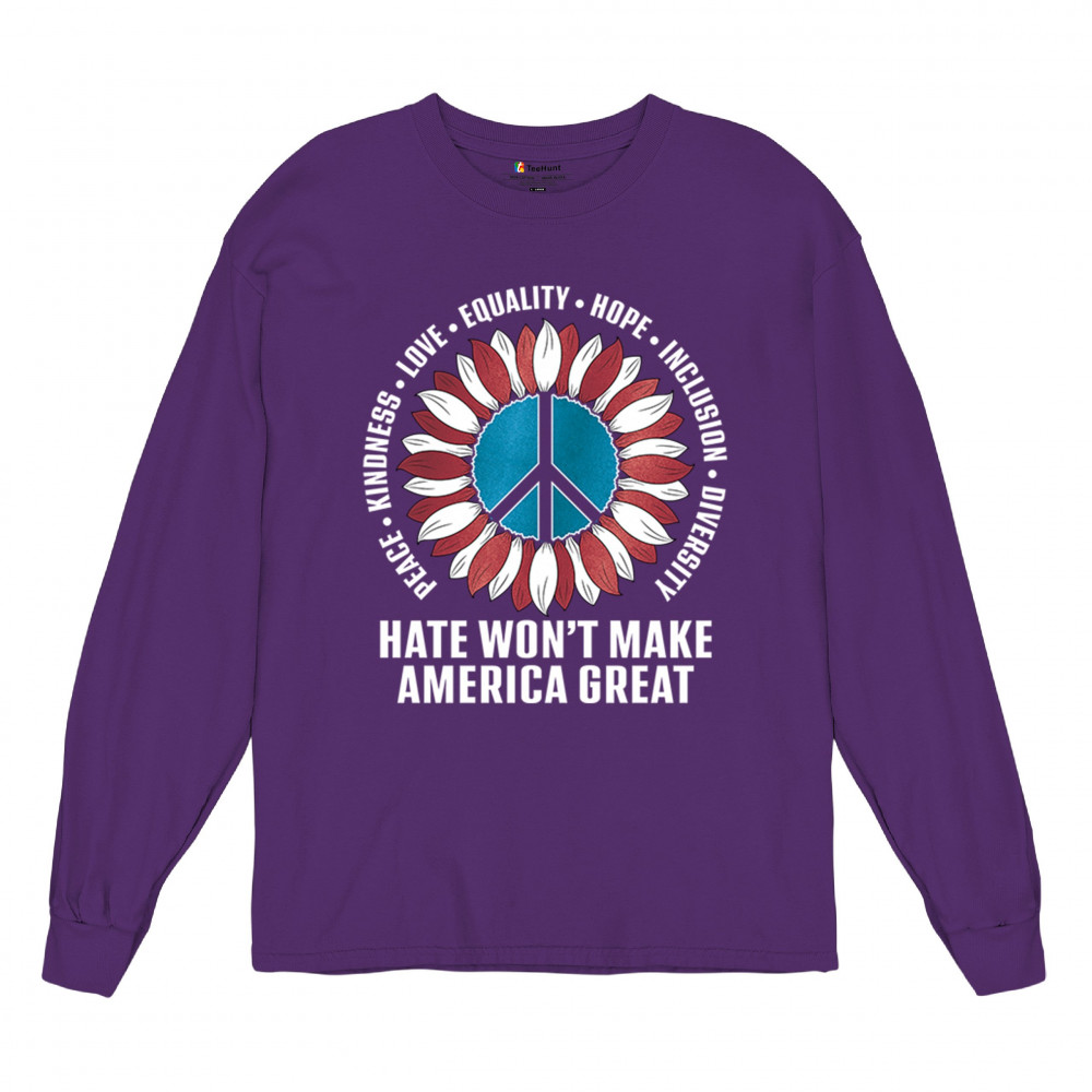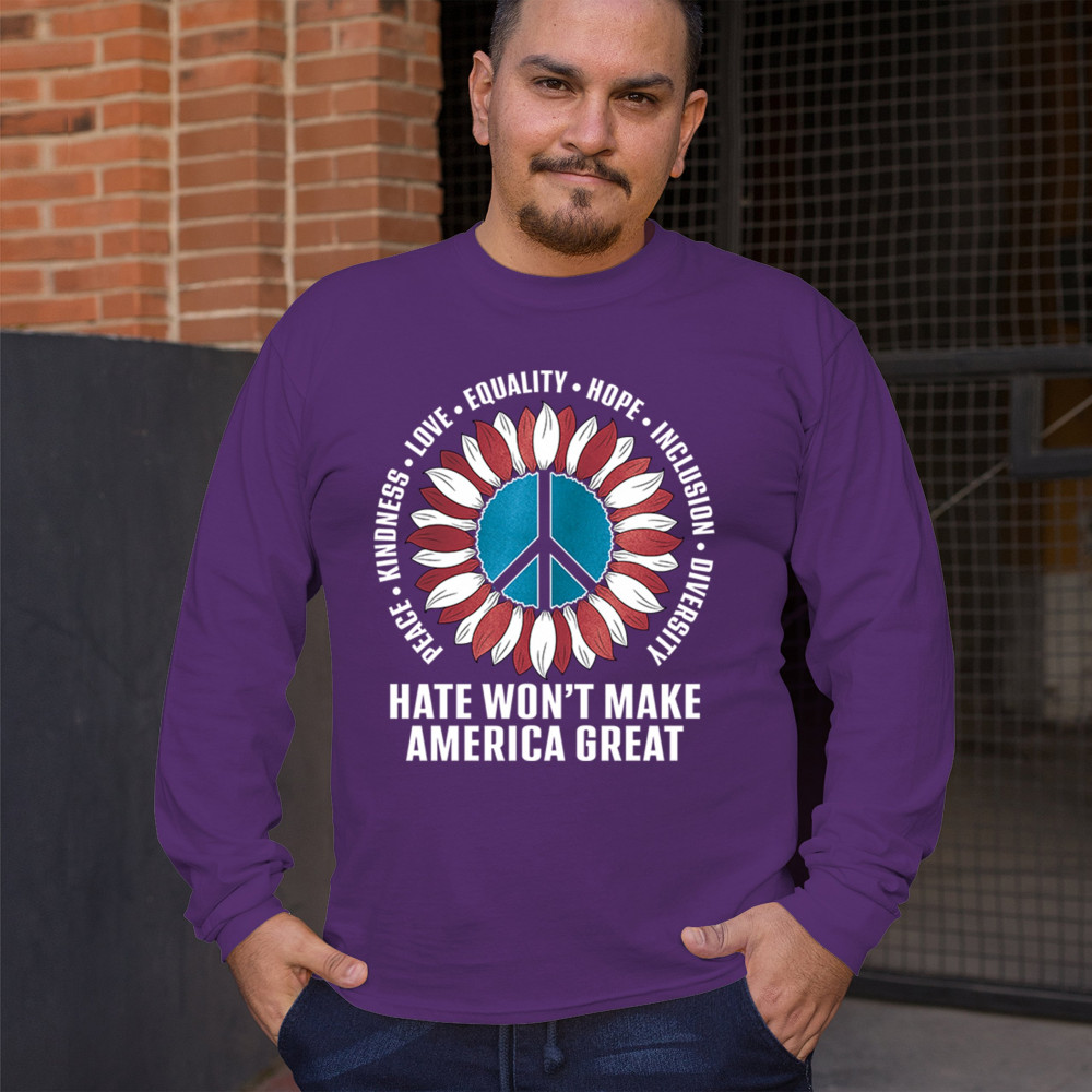 Embrace the message of love, equality, and unity with this eye-catching design. The sunflower and peace symbol represent a commitment to kindness and inclusion, rejecting hate and division. Perfect for those who support liberal values, this design is a bold statement against negativity and for a brighter future. Wear it proudly to show your belief in a diverse, united America. Let this design be a symbol of hope and progress for all.