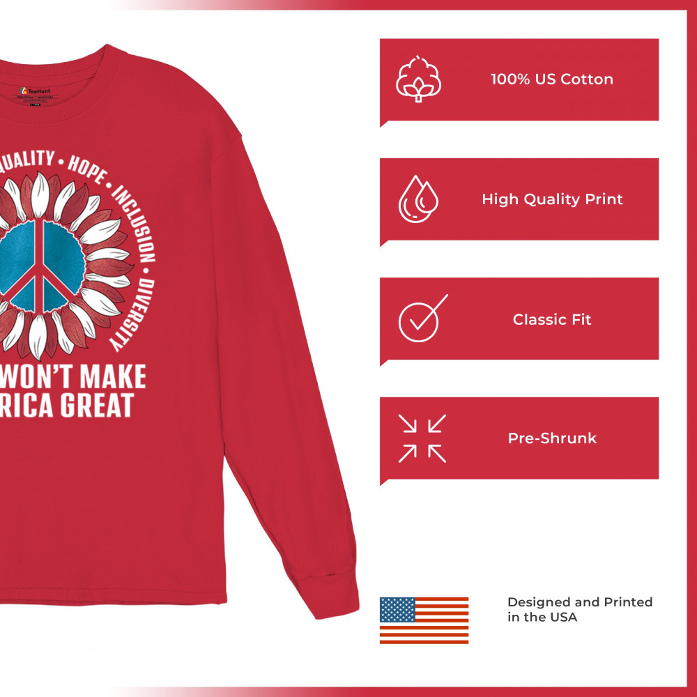 Embrace the message of love, equality, and unity with this eye-catching design. The sunflower and peace symbol represent a commitment to kindness and inclusion, rejecting hate and division. Perfect for those who support liberal values, this design is a bold statement against negativity and for a brighter future. Wear it proudly to show your belief in a diverse, united America. Let this design be a symbol of hope and progress for all.