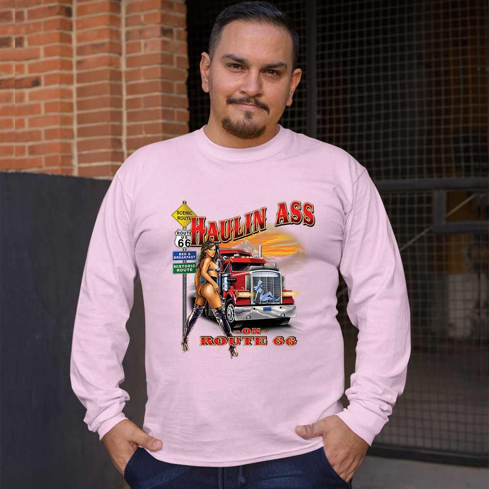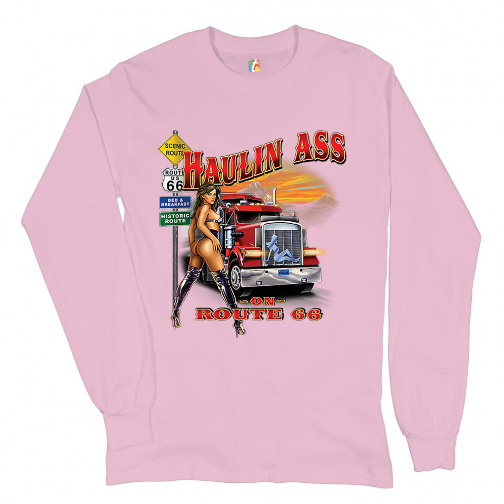 A print featuring a scantily-clad brunette woman standing by a Route 66 sign. A classic truck is passing by and the print says: "Haulin Ass on Route 66". A great choice for anyone who appreciates beautiful women and is a fan of the legendary Mother Road.