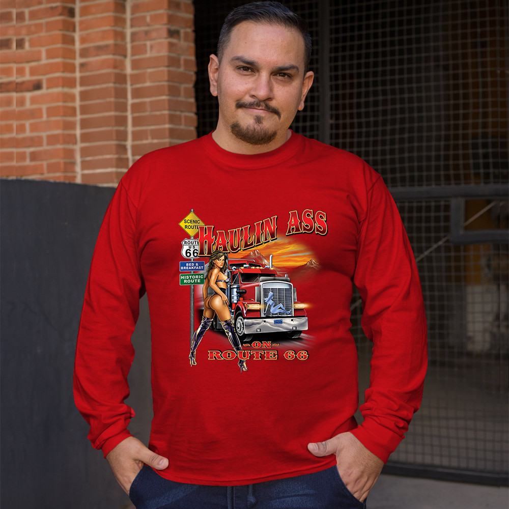 A print featuring a scantily-clad brunette woman standing by a Route 66 sign. A classic truck is passing by and the print says: "Haulin Ass on Route 66". A great choice for anyone who appreciates beautiful women and is a fan of the legendary Mother Road.