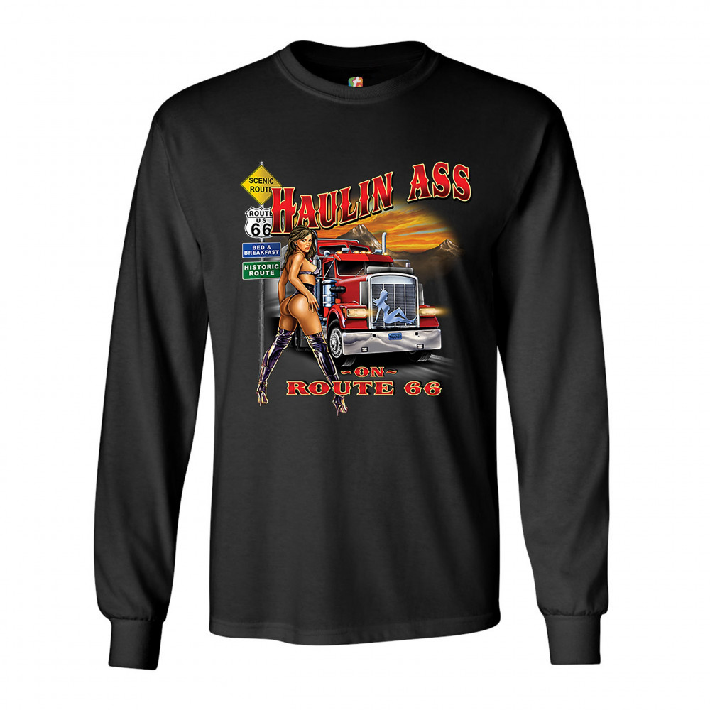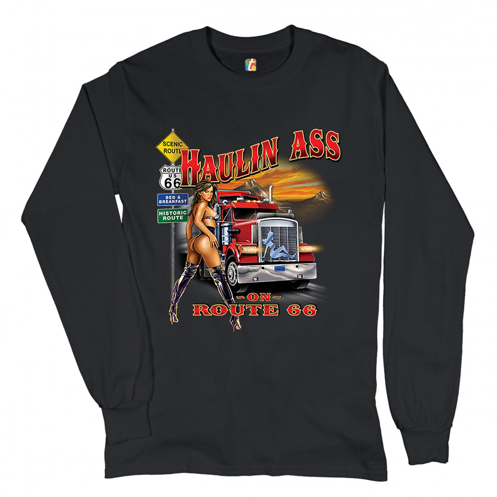 A print featuring a scantily-clad brunette woman standing by a Route 66 sign. A classic truck is passing by and the print says: "Haulin Ass on Route 66". A great choice for anyone who appreciates beautiful women and is a fan of the legendary Mother Road.