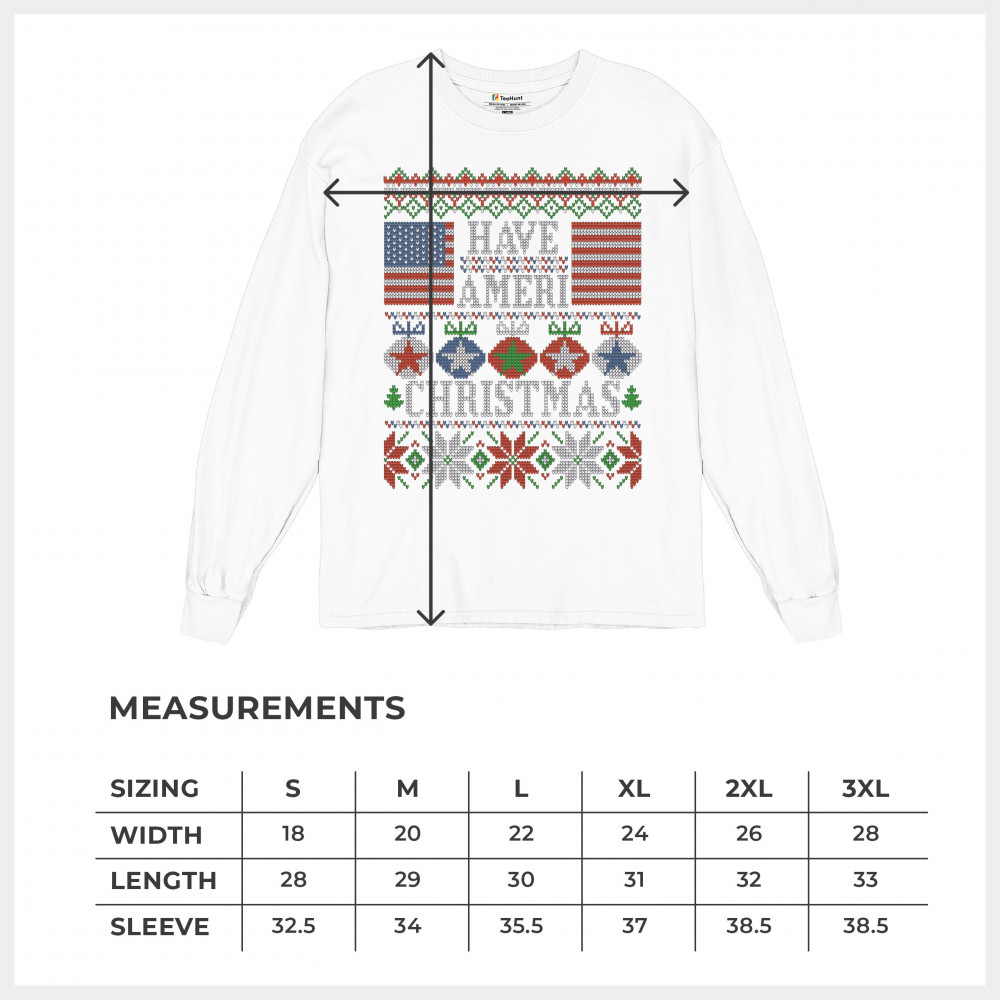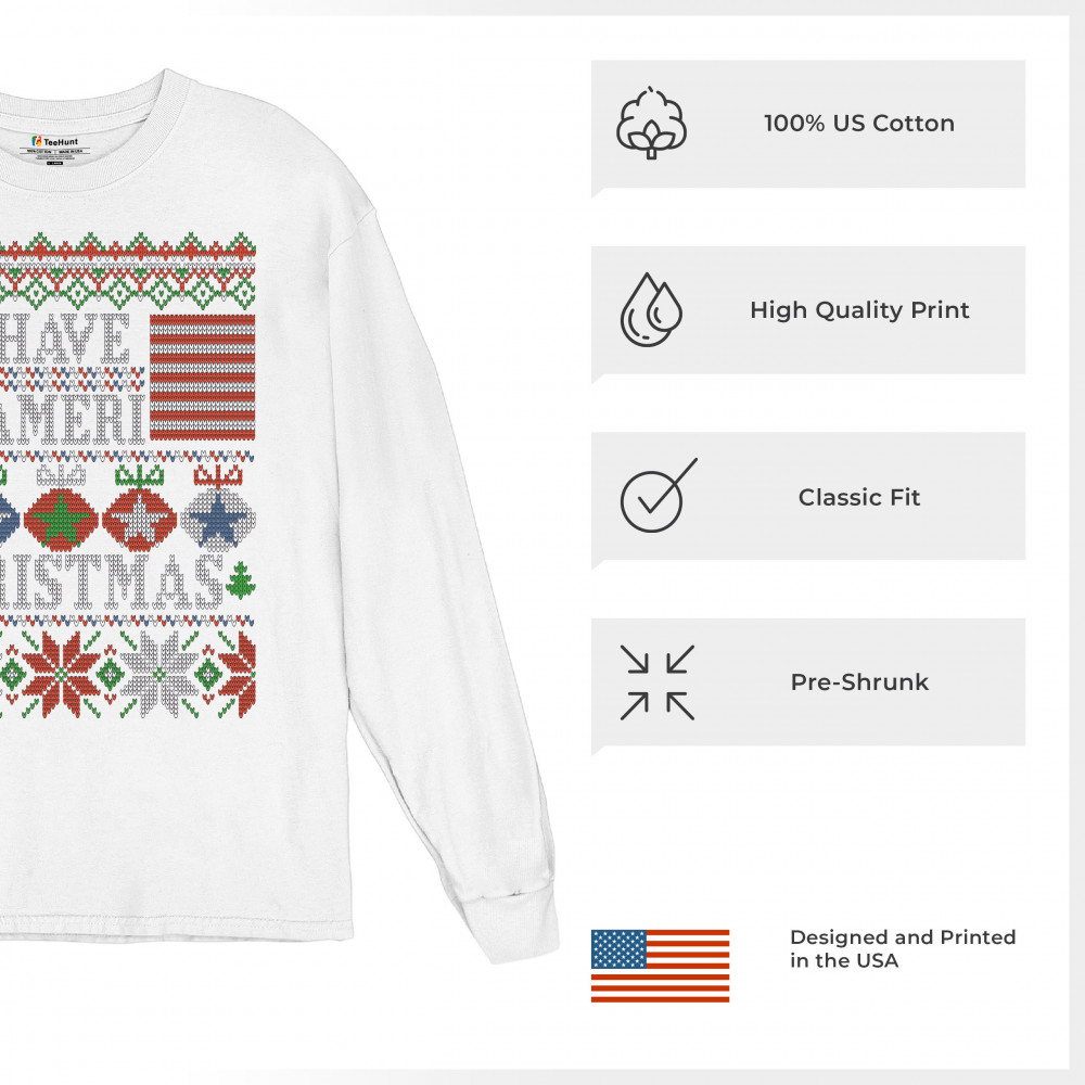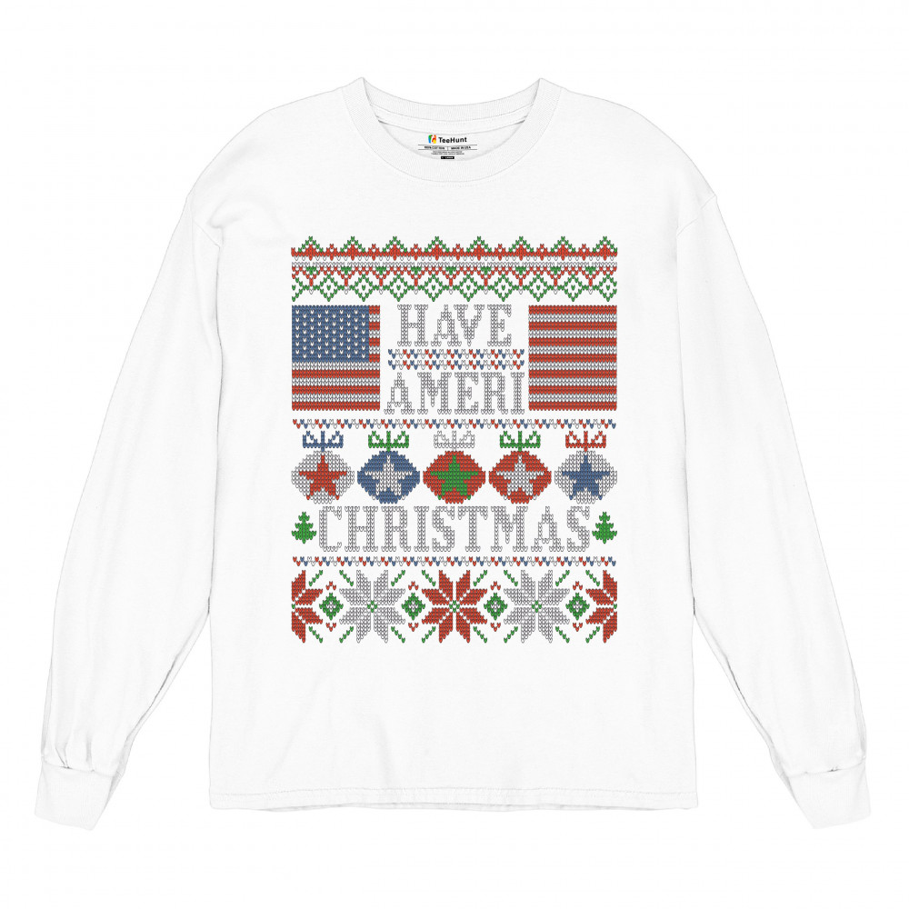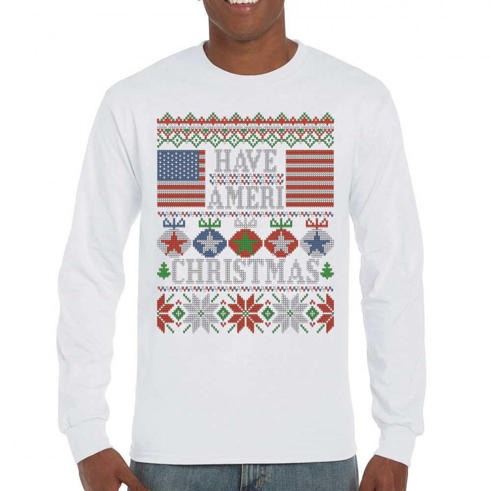 HAVE AMERI CHRISTMAS long sleeve t-shirt american flag ugly sweater patriotic white
