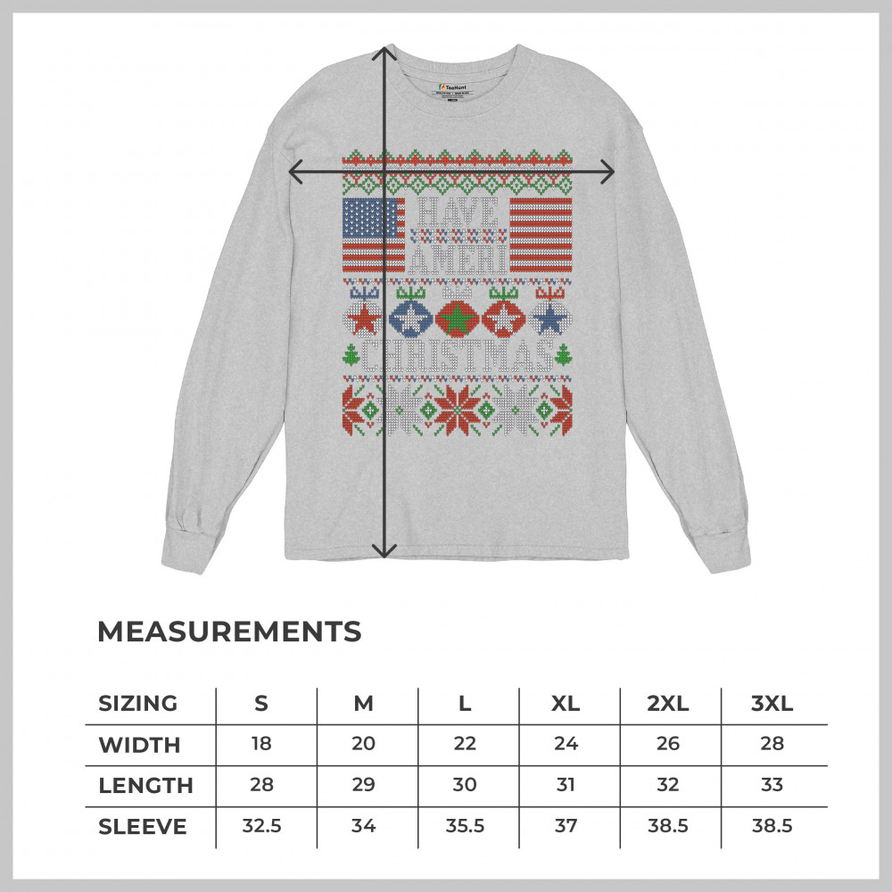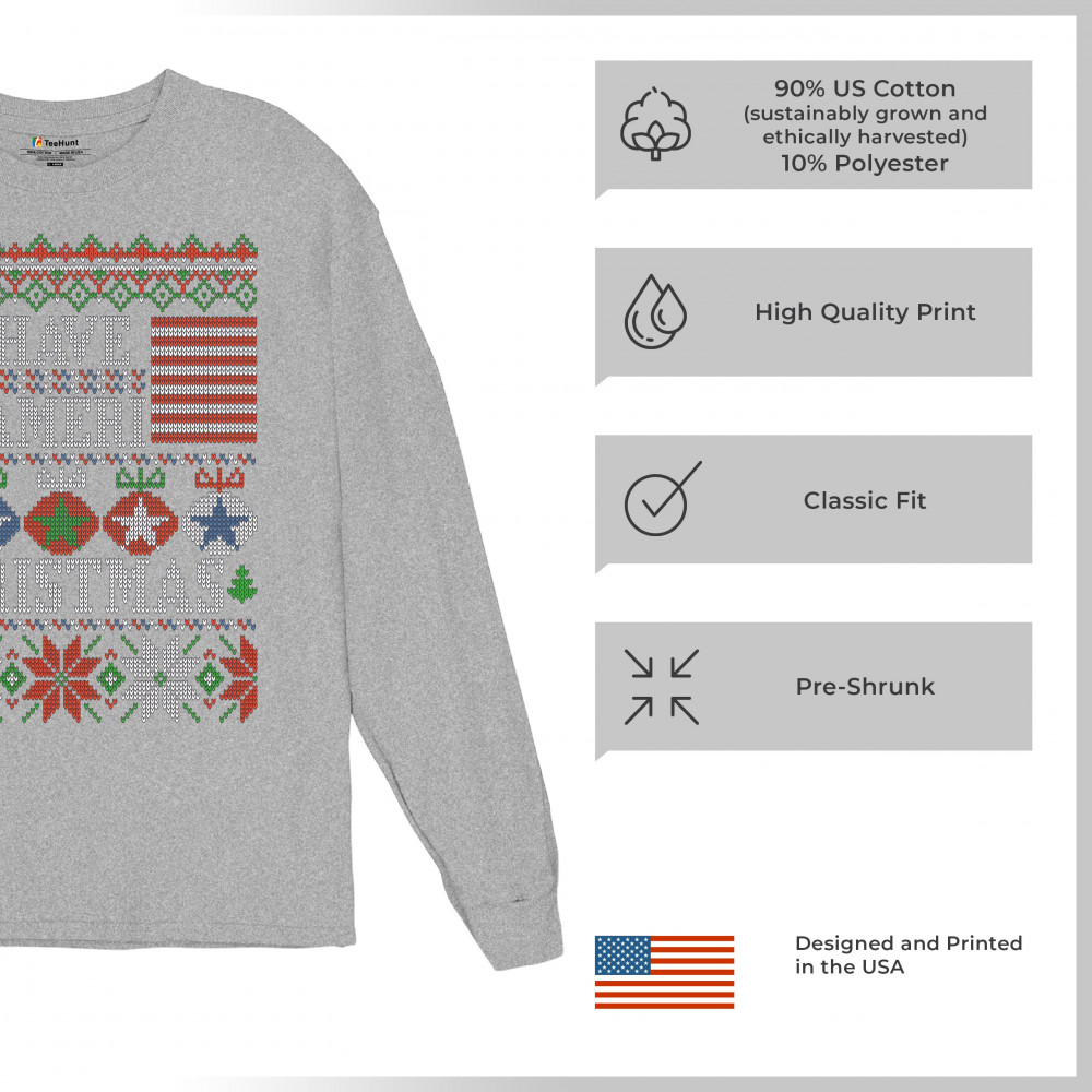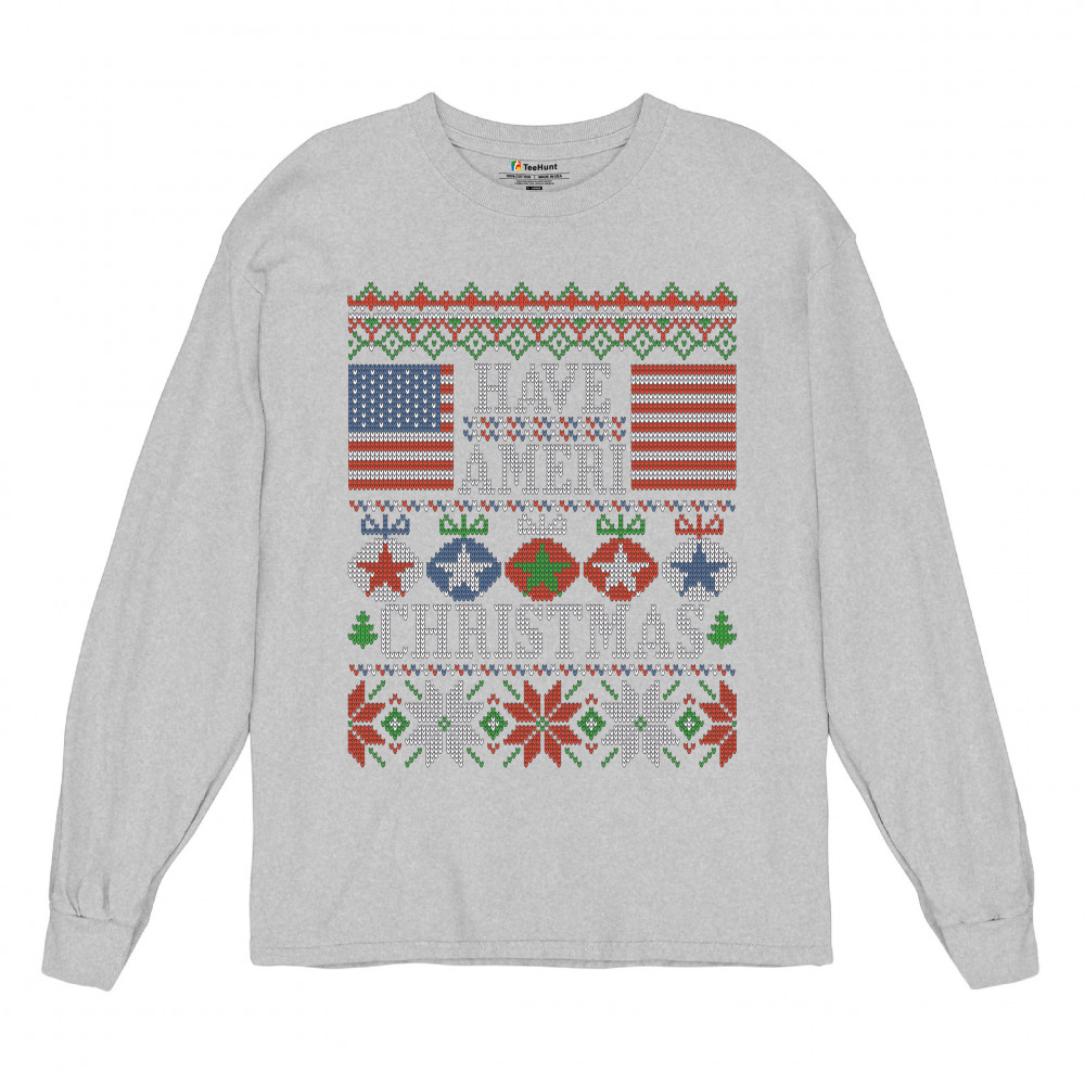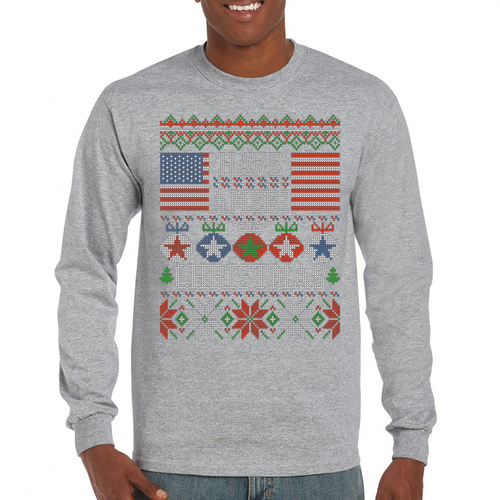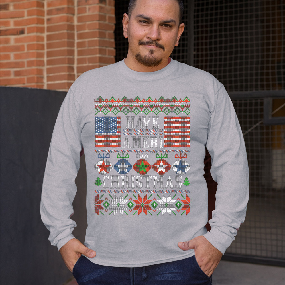 HAVE AMERI CHRISTMAS long sleeve t-shirt american flag ugly sweater patriotic gray