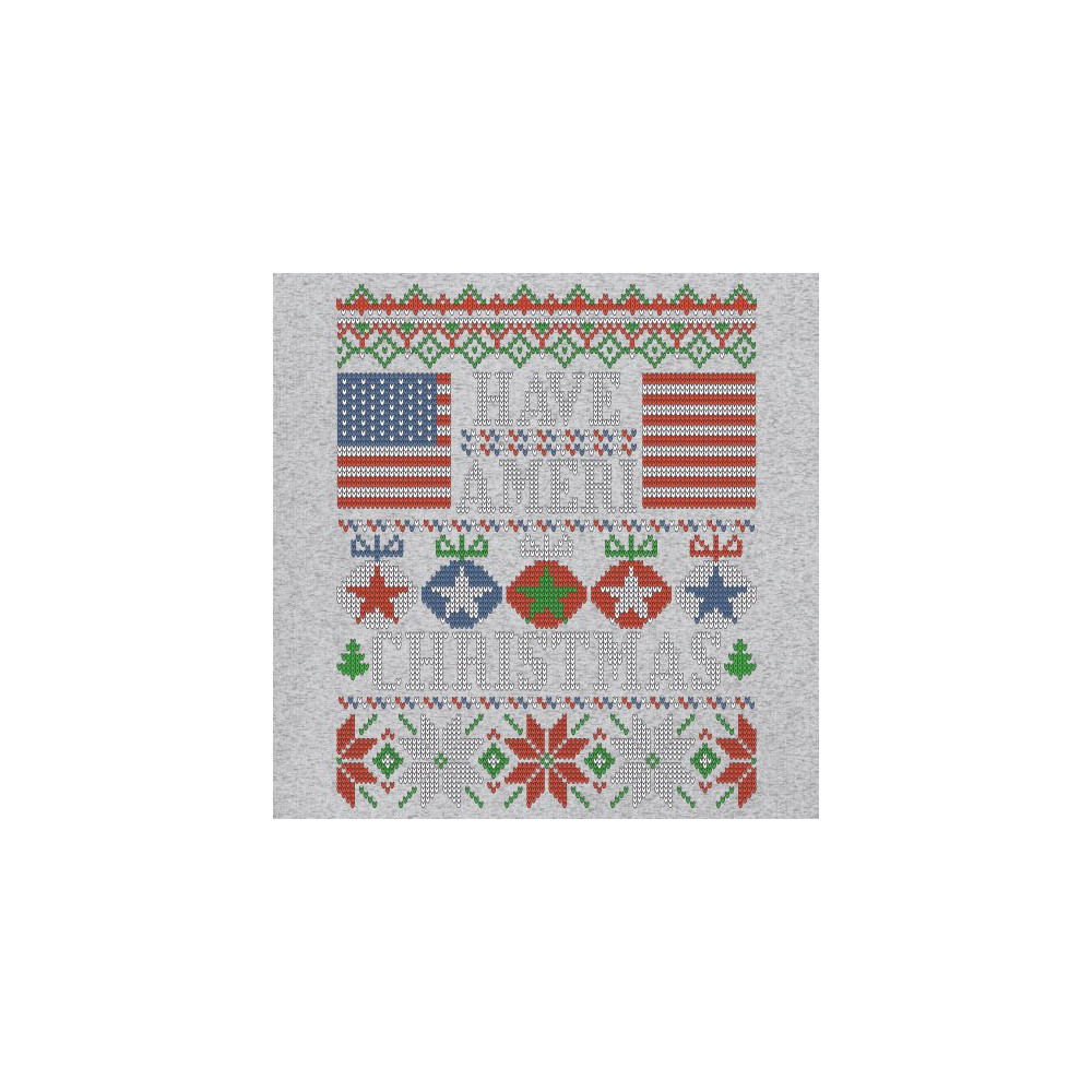 A print saying: "Have Ameri Christmas" and featuring an American flag and five Christmas bulbs. The print is designed as an ugly sweater. Amazing choice to express your patriotism while celebrating Christmas.