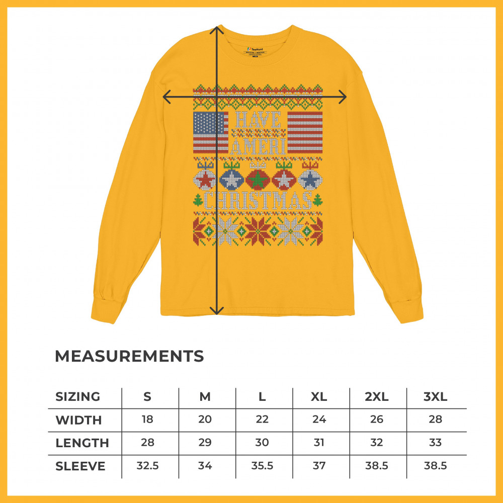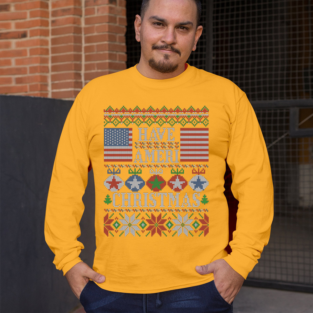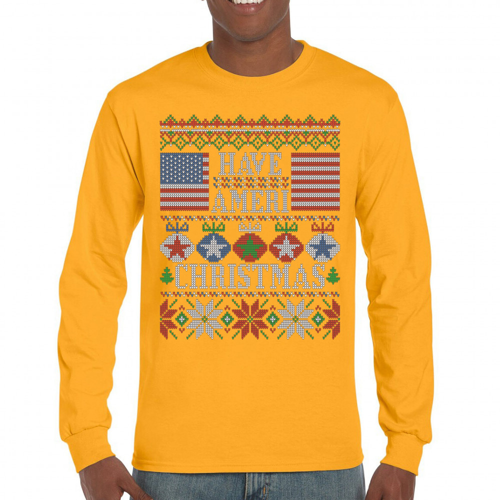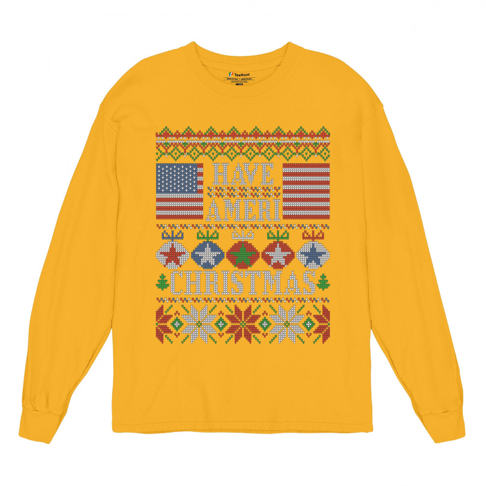 HAVE AMERI CHRISTMAS long sleeve t-shirt american flag ugly sweater patriotic yellow