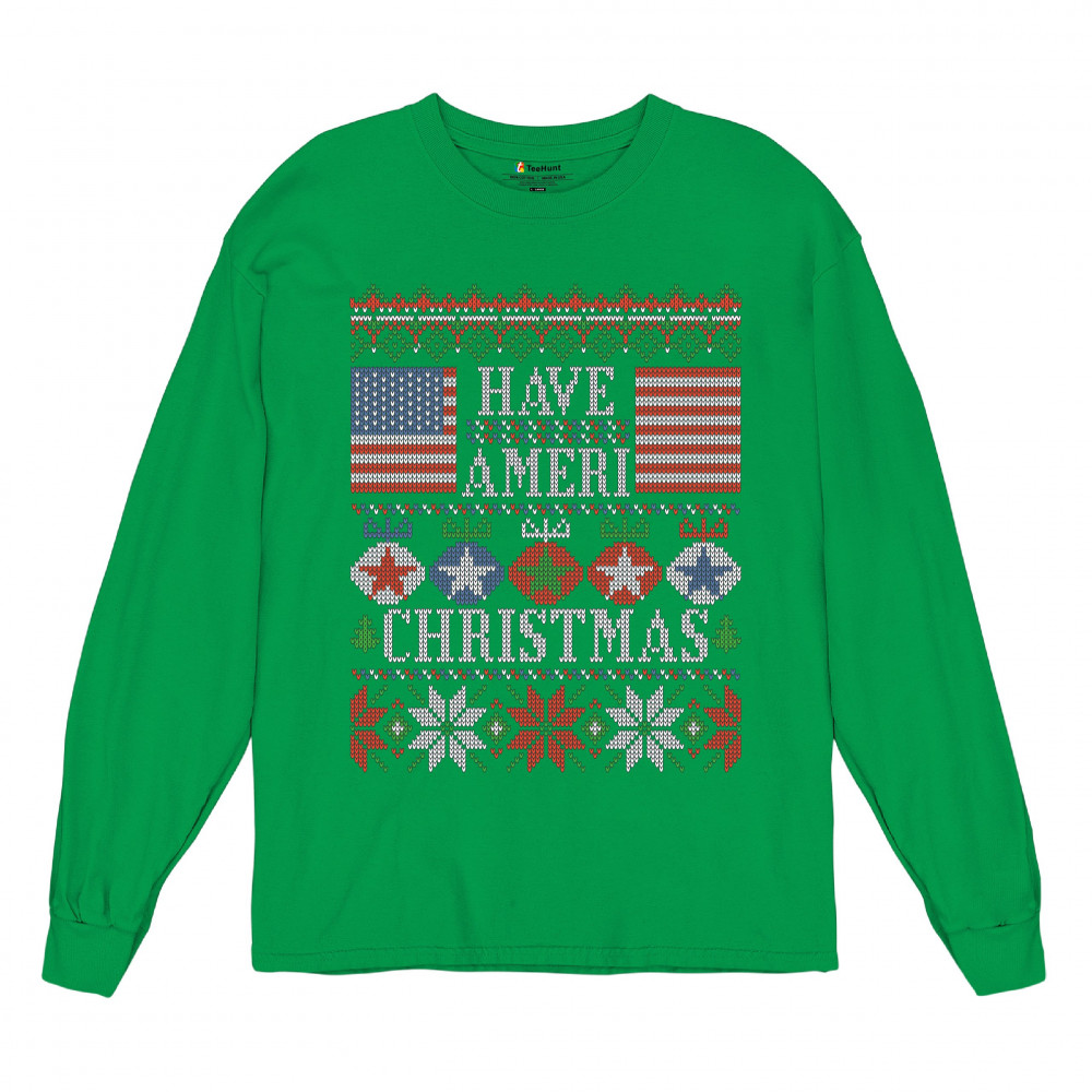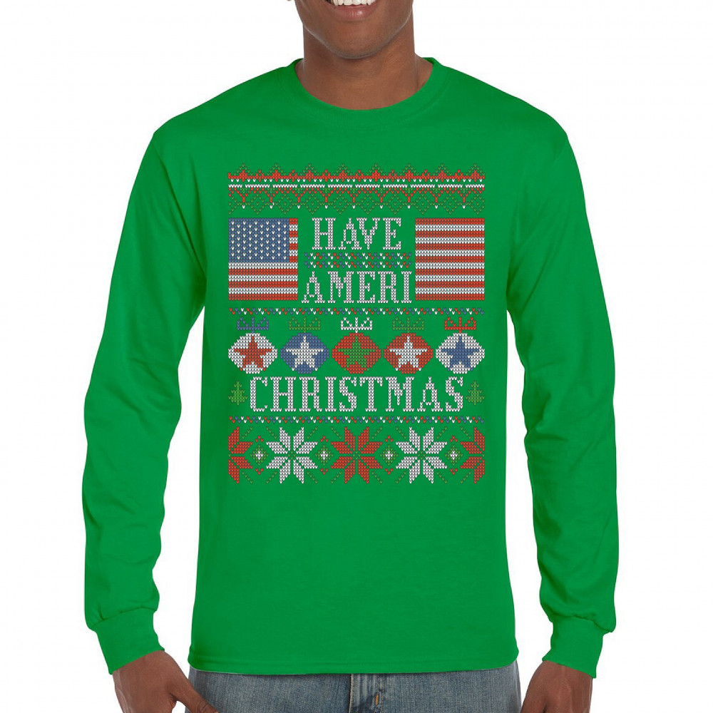 HAVE AMERI CHRISTMAS long sleeve t-shirt american flag ugly sweater patriotic green