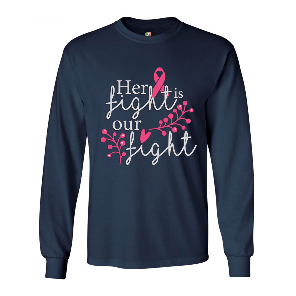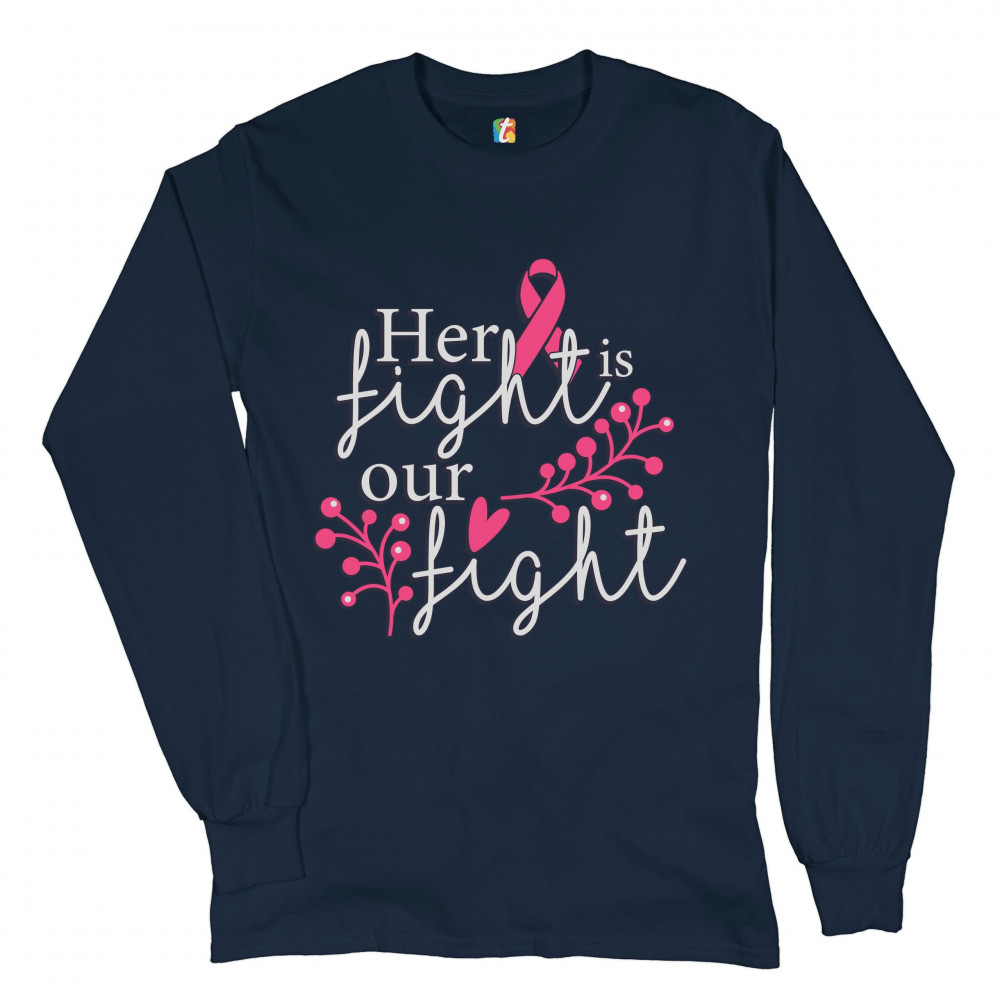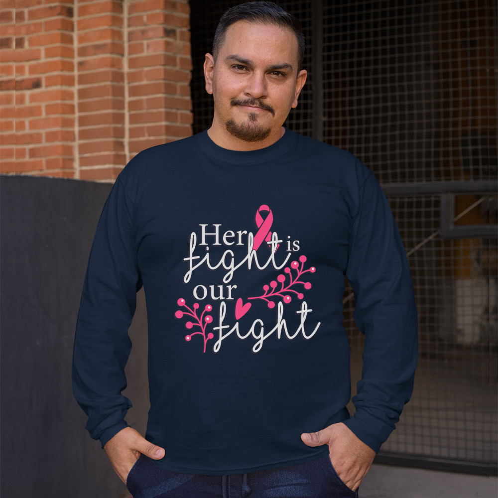 HER FIGHT IS OUR FIGHT long sleeve t-shirt breast cancer support pink ribbon navy blue